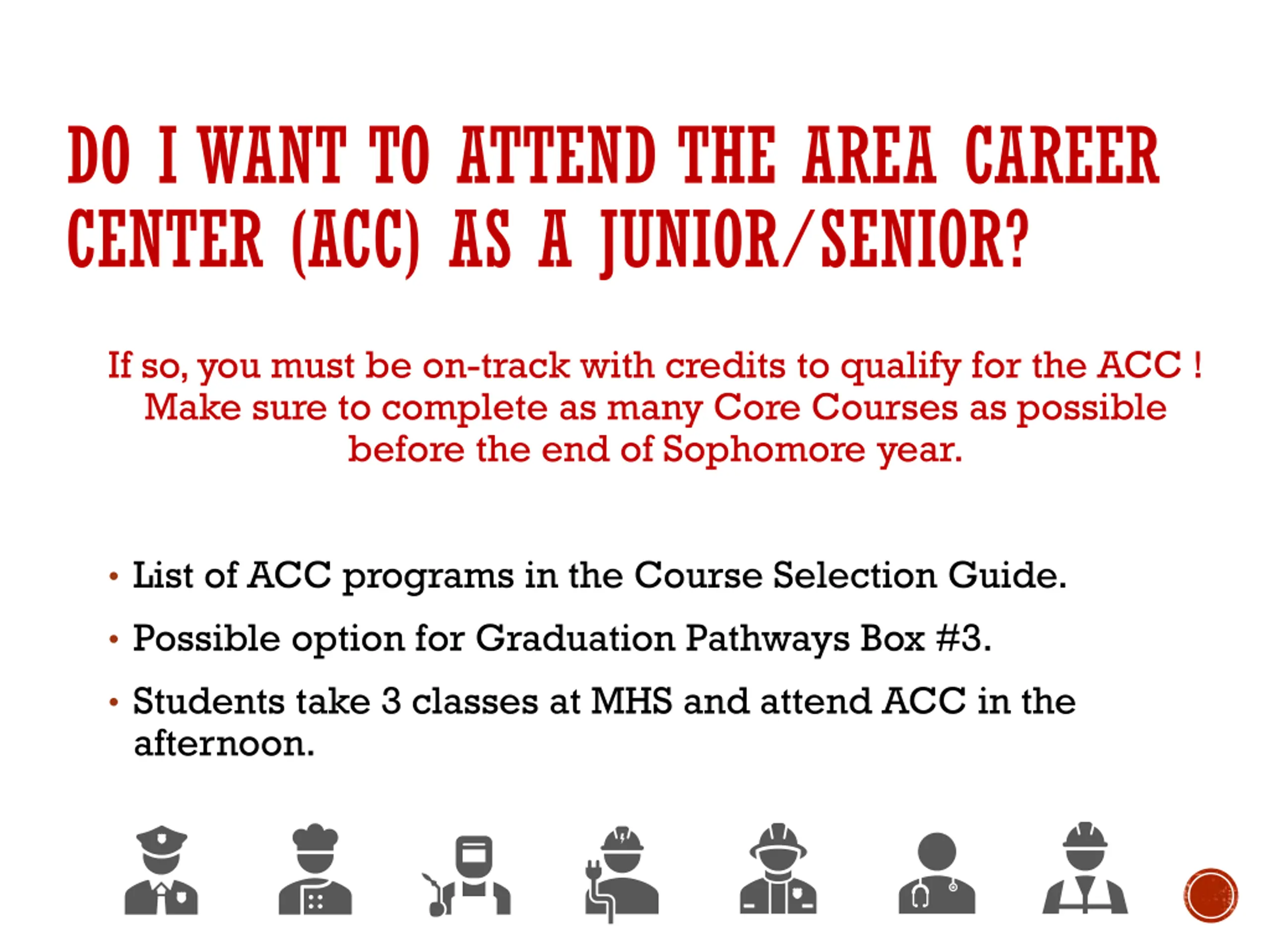 DO I WANT TO ATTEND THE AREA CAREER CENTER (ACC)AS A JUNIOR/SENIOR? If so, you must be on-track with credits to qualify for the ACC ! Make sure to complete as many Core Courses as possible before the end of Sophomore year. List of ACC programs in the Course Selection Guide. Possible option for Graduation Pathways Box #3. Students take 3 classes at MHS and attend ACC in the afternoon.
