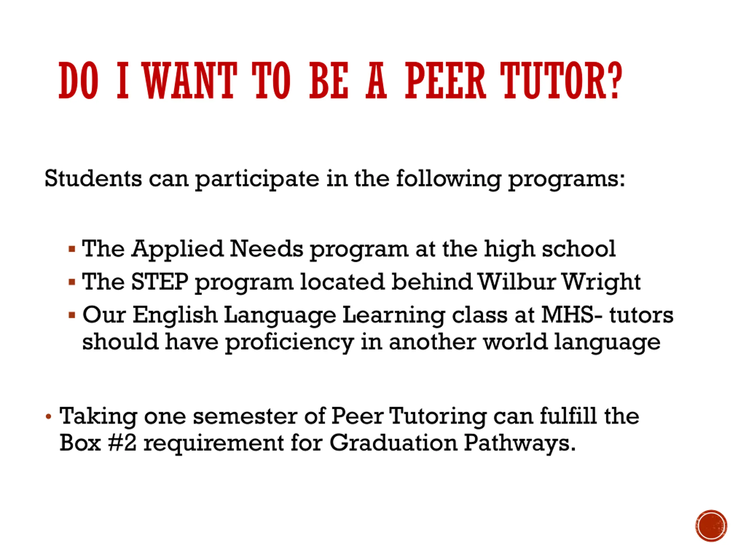 DO I WANT TO BE A PEER TUTOR? Students can participate in the following programs: The Applied Needs program at the high school The STEP program located behind Wilbur Wright Our English Language Learning class at MHS- tutors should have proficiency in another world language Taking one semester of Peer Tutoring can fulfill the Box #2 requirement for Graduation Pathways.