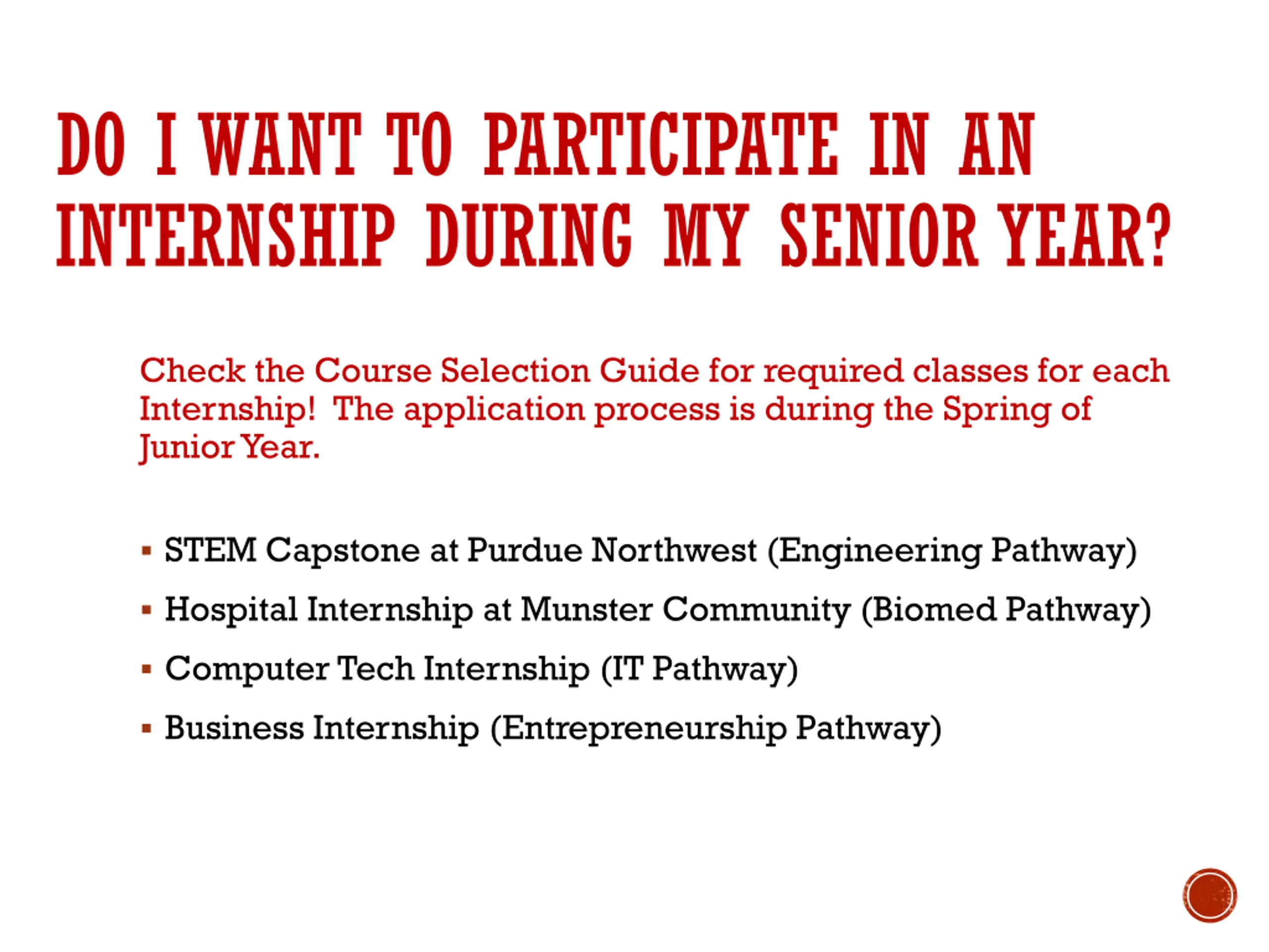 DO I WANT TO PARTICIPATE IN AN INTERNSHIP DURING MY SENIOR YEAR? Check the Course Selection Guide for required classes for each Internship! The application process is during the Spring of Junior Year. STEM Capstone at Purdue Northwest (Engineering Pathway) Hospital Internship at Munster Community (Biomed Pathway) Computer Tech Internship (IT Pathway) Business Internship (Entrepreneurship Pathway)