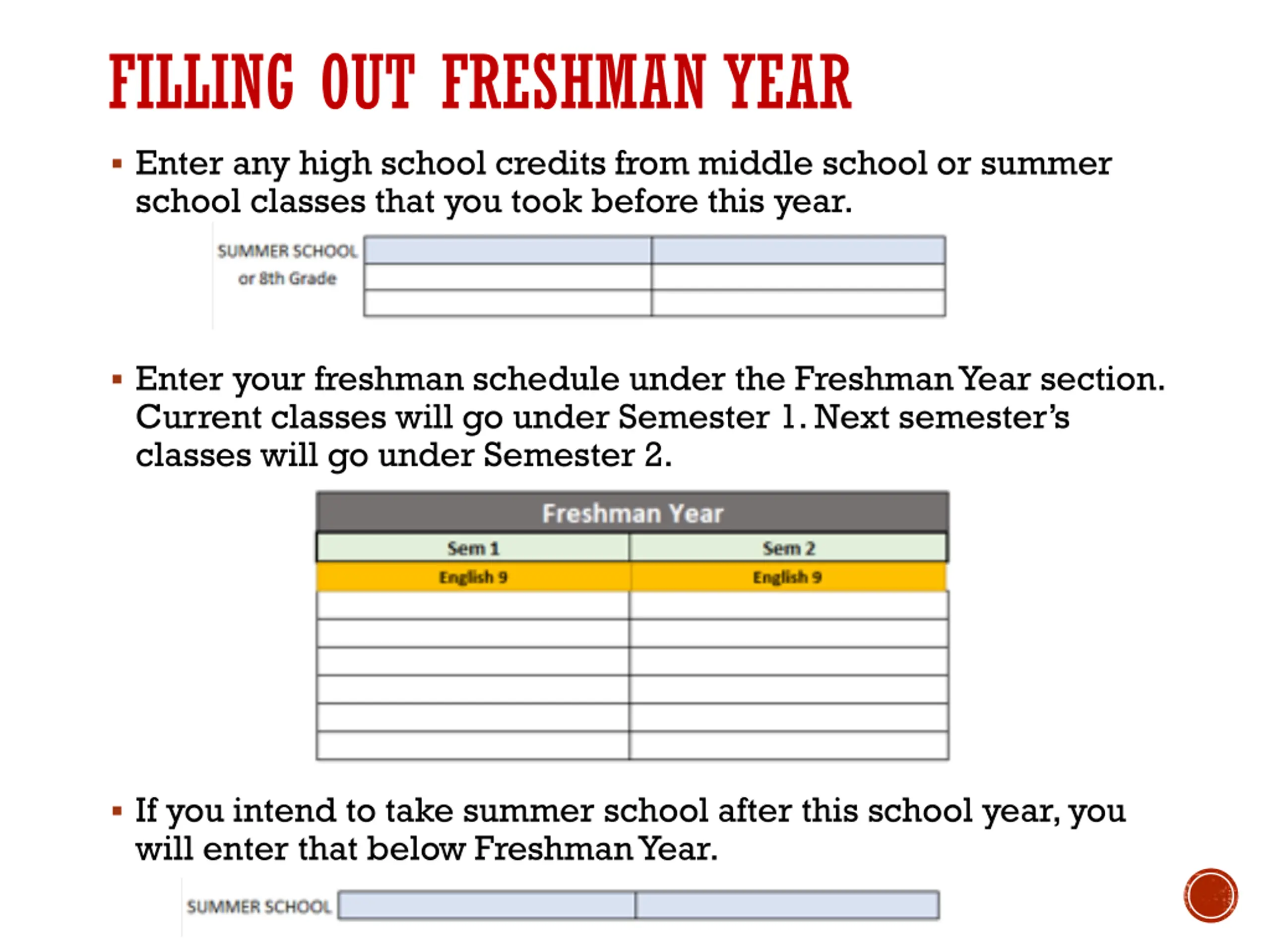 FILLING OUT FRESHMAN YEAR Enter any high school credits from middle school or summer school classes that you took before this year. Enter your freshman schedule under the Freshman Year section. Current classes will go under Semester 1. Next semester s classes will go under Semester 2. If you intend to take summer school after this school year, you will enter that below Freshman Year.
