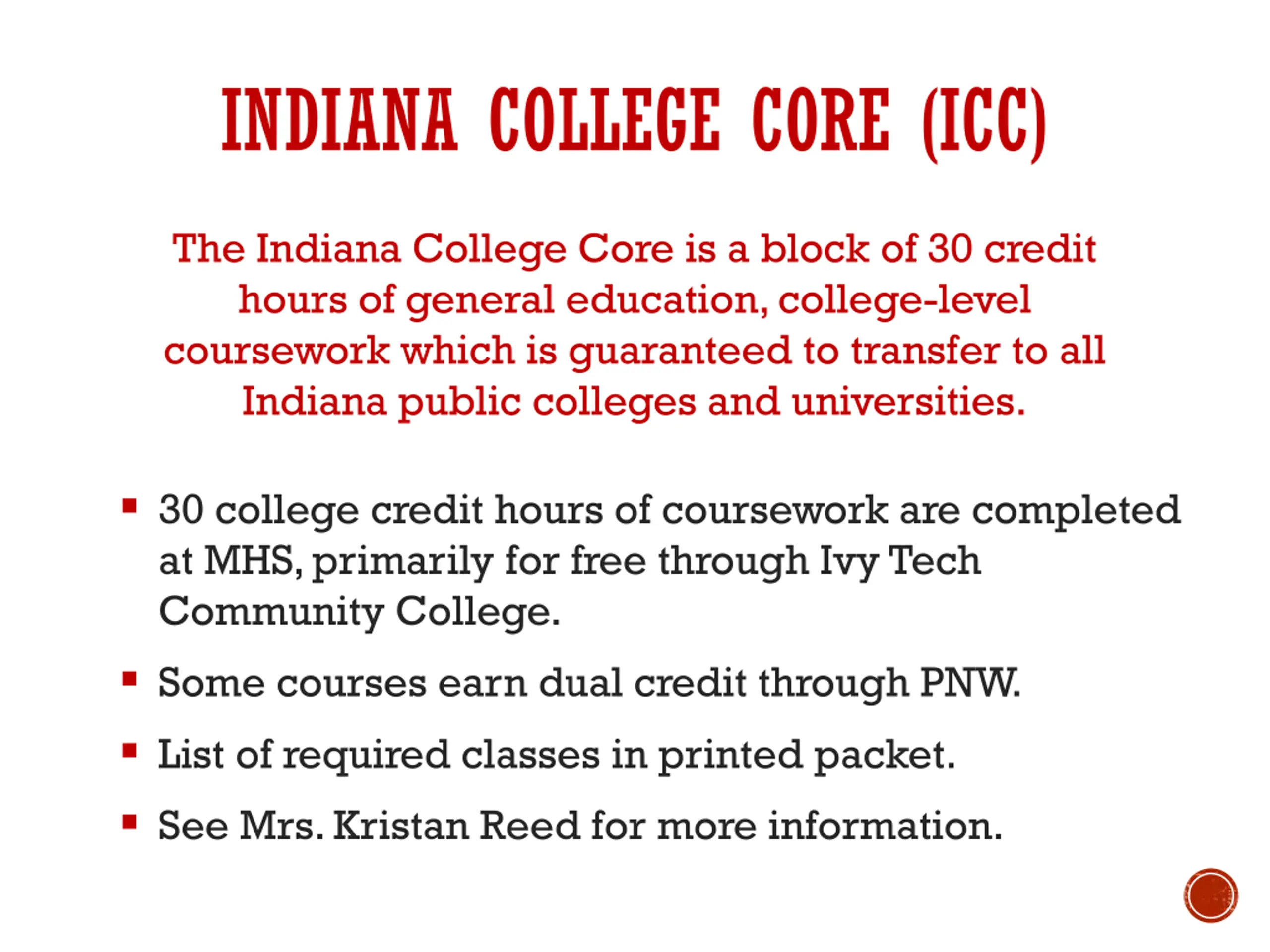 INDIANA COLLEGE CORE (ICC) The Indiana College Core is a block of 30 credit hours of general education, college-level coursework which is guaranteed to transfer to all Indiana public colleges and universities. 30 college credit hours of coursework are completed at MHS, primarily for free through Ivy Tech Community College. Some courses earn dual credit through PNW. List of required classes in printed packet. See Mrs. Kristan Reed for more information.