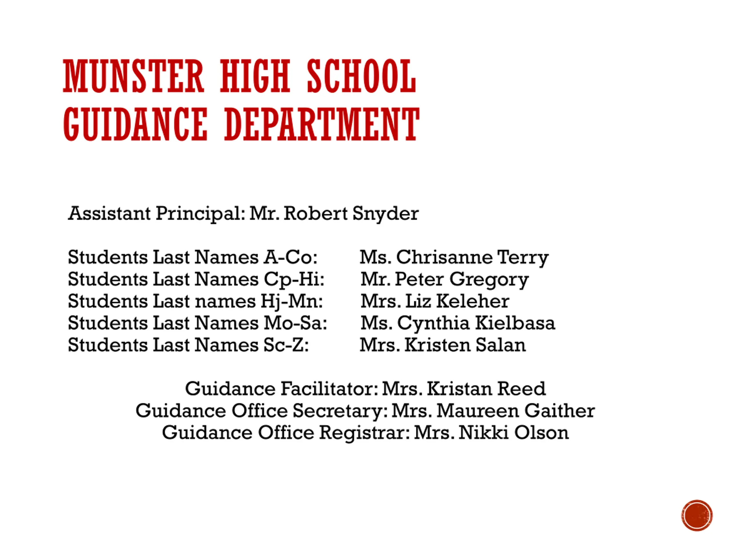 MUNSTER HIGH SCHOOL GUIDANCE DEPARTMENT Assistant Principal: Mr. Robert Snyder Students Last Names A-Co: Students Last Names Cp-Hi: Students Last names Hj-Mn: Students Last Names Mo-Sa: Students Last Names Sc-Z: Ms. Chrisanne Terry Mr. Peter Gregory Mrs. Liz Keleher Ms. Cynthia Kielbasa Mrs. Kristen Salan Guidance Facilitator: Mrs. Kristan Reed Guidance Office Secretary: Mrs. Maureen Gaither Guidance Office Registrar: Mrs. Nikki Olson
