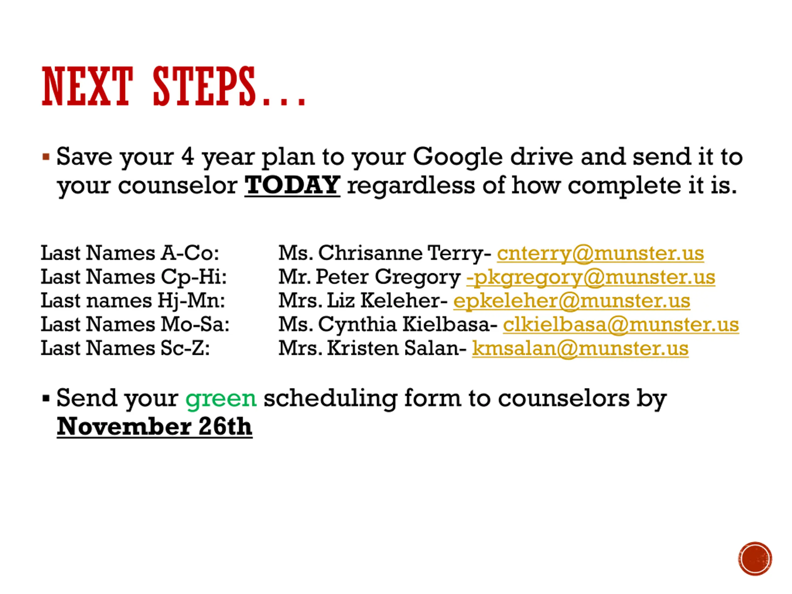 NEXT STEPS Save your 4 year plan to your Google drive and send it to your counselor TODAY regardless of how complete it is. Last Names A-Co: Last Names Cp-Hi: Mr. Peter Gregory -pkgregory@munster.us Last names Hj-Mn: Mrs. Liz Keleher- epkeleher@munster.us Last Names Mo-Sa: Ms. Cynthia Kielbasa- clkielbasa@munster.us Last Names Sc-Z: Mrs. Kristen Salan- kmsalan@munster.us Ms. Chrisanne Terry- cnterry@munster.us Send your green scheduling form to counselors by November 26th