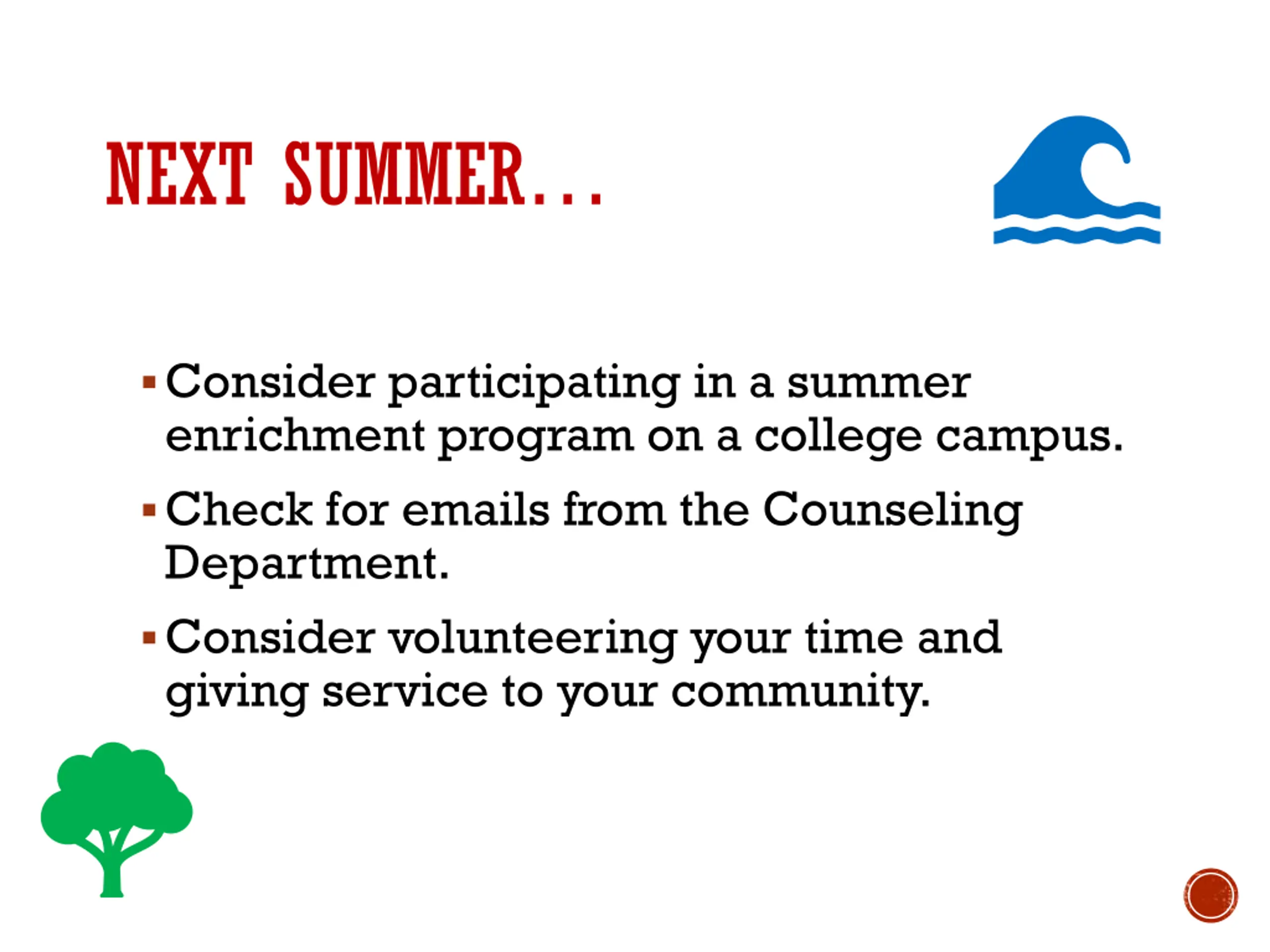 NEXT SUMMER Consider participating in a summer enrichment program on a college campus. Check for emails from the Counseling Department. Consider volunteering your time and giving service to your community.