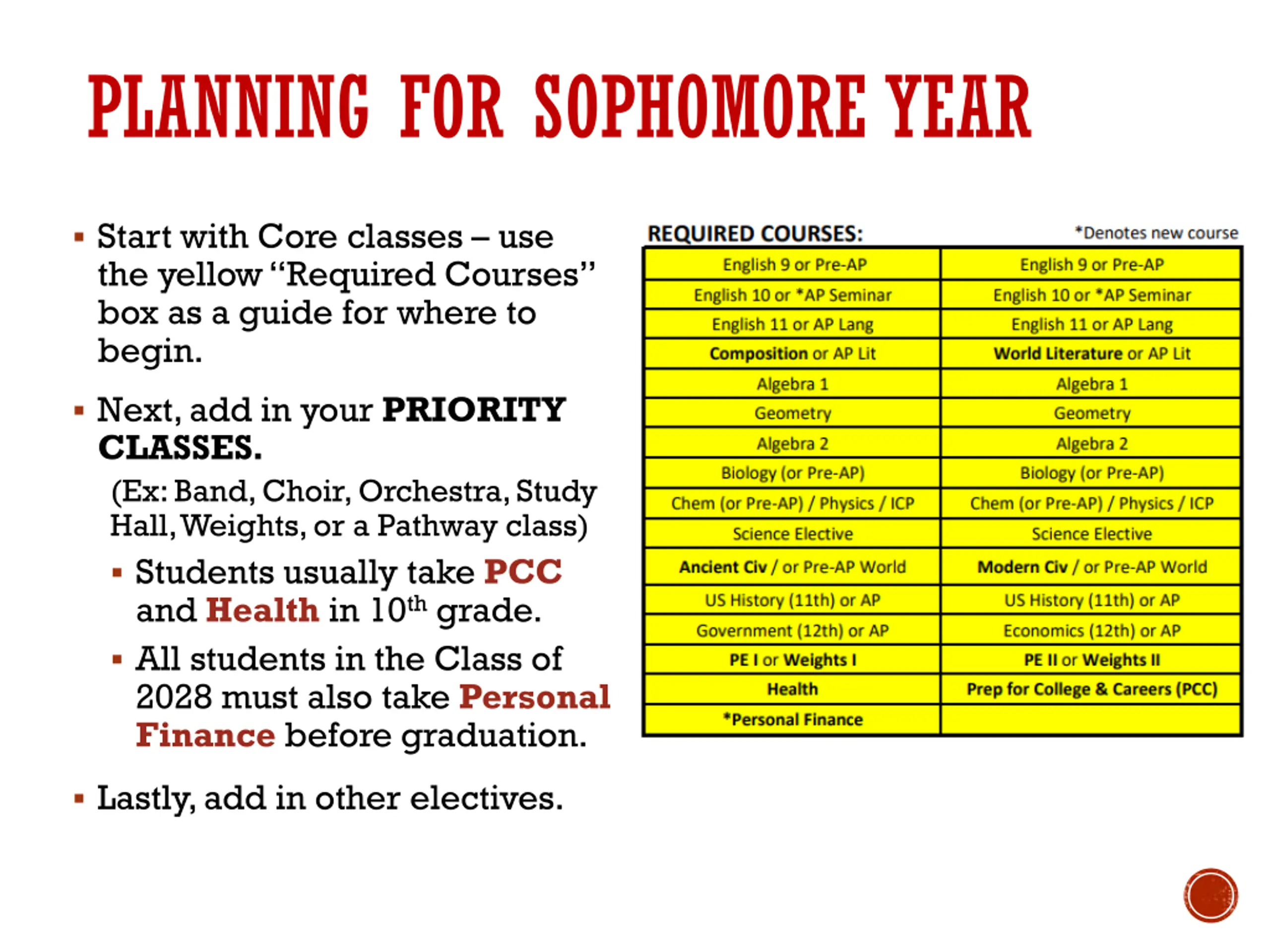 PLANNING FOR SOPHOMORE YEAR Start with Core classes use the yellow Required Courses box as a guide for where to begin. Next, add in your PRIORITY CLASSES. (Ex: Band, Choir, Orchestra, Study Hall, Weights, or a Pathway class) Students usually take PCC and Health in 10th grade. All students in the Class of 2028 must also take Personal Finance before graduation. Lastly, add in other electives.