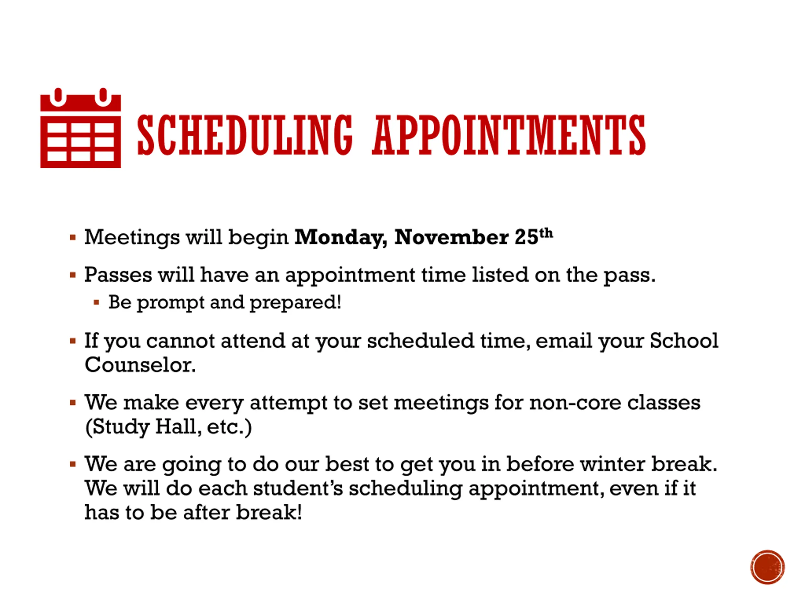 SCHEDULING APPOINTMENTS Meetings will begin Monday, November 25th Passes will have an appointment time listed on the pass. Be prompt and prepared! If you cannot attend at your scheduled time, email your School Counselor. We make every attempt to set meetings for non-core classes (Study Hall, etc.) We are going to do our best to get you in before winter break. We will do each student s scheduling appointment, even if it has to be after break!