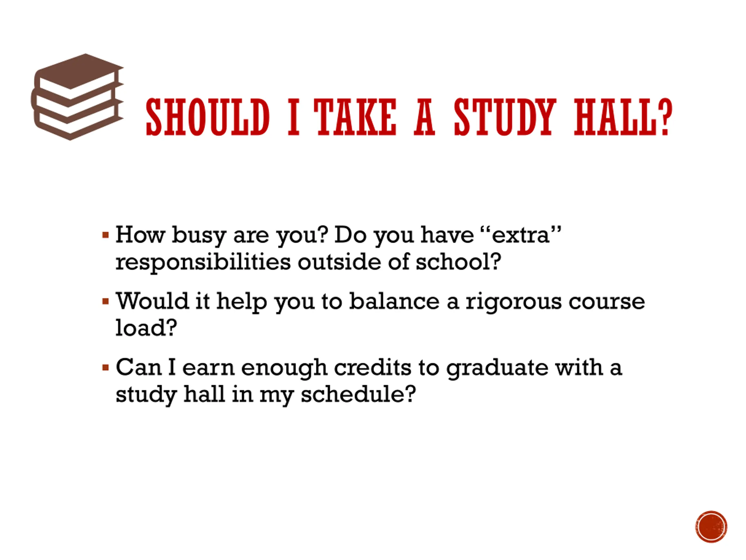 SHOULD I TAKE A STUDY HALL? How busy are you? Do you have extra responsibilities outside of school? Would it help you to balance a rigorous course load? Can I earn enough credits to graduate with a study hall in my schedule?