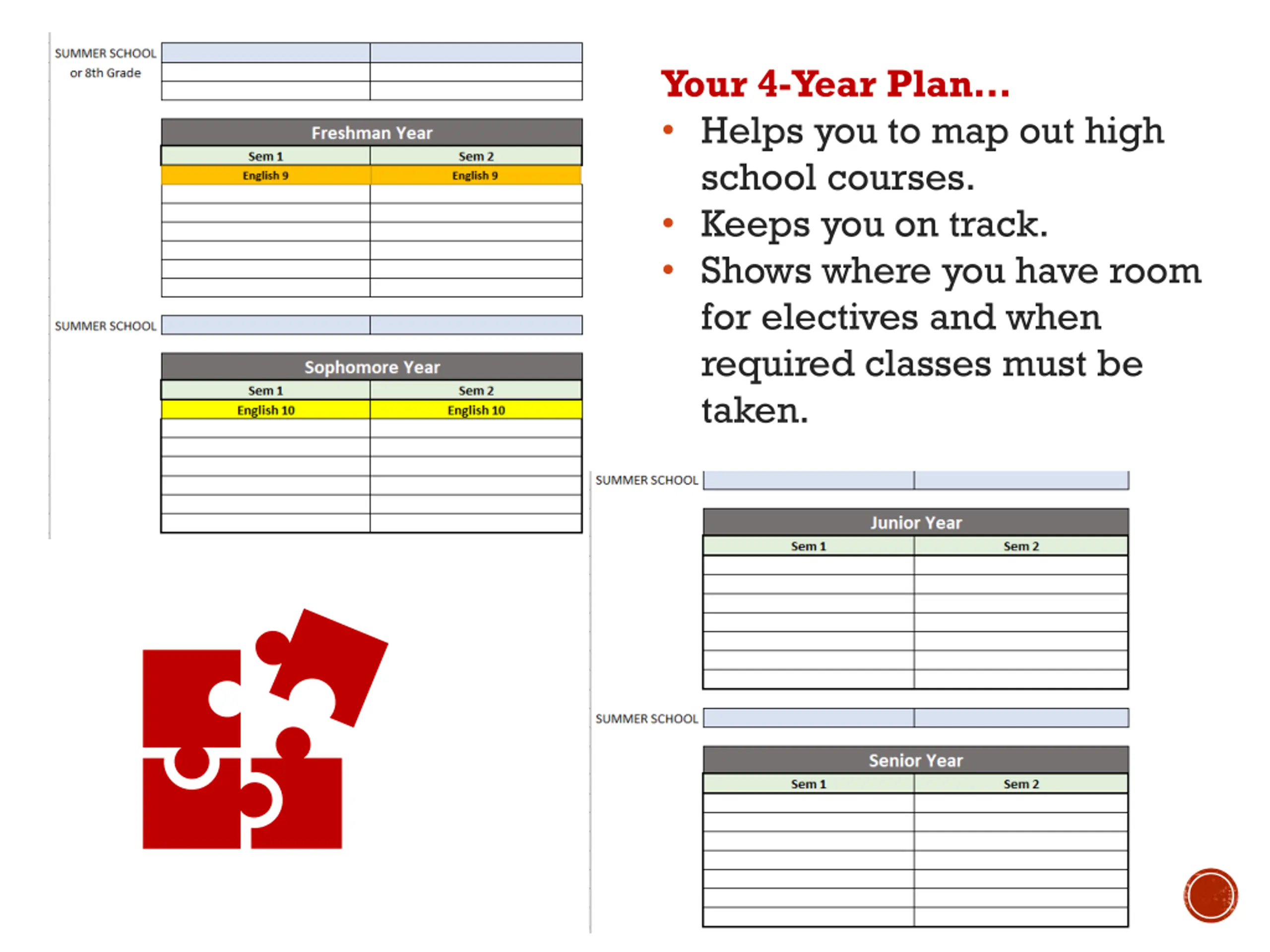 Your 4-Year Plan Helps you to map out high school courses. Keeps you on track. Shows where you have room for electives and when required classes must be taken.