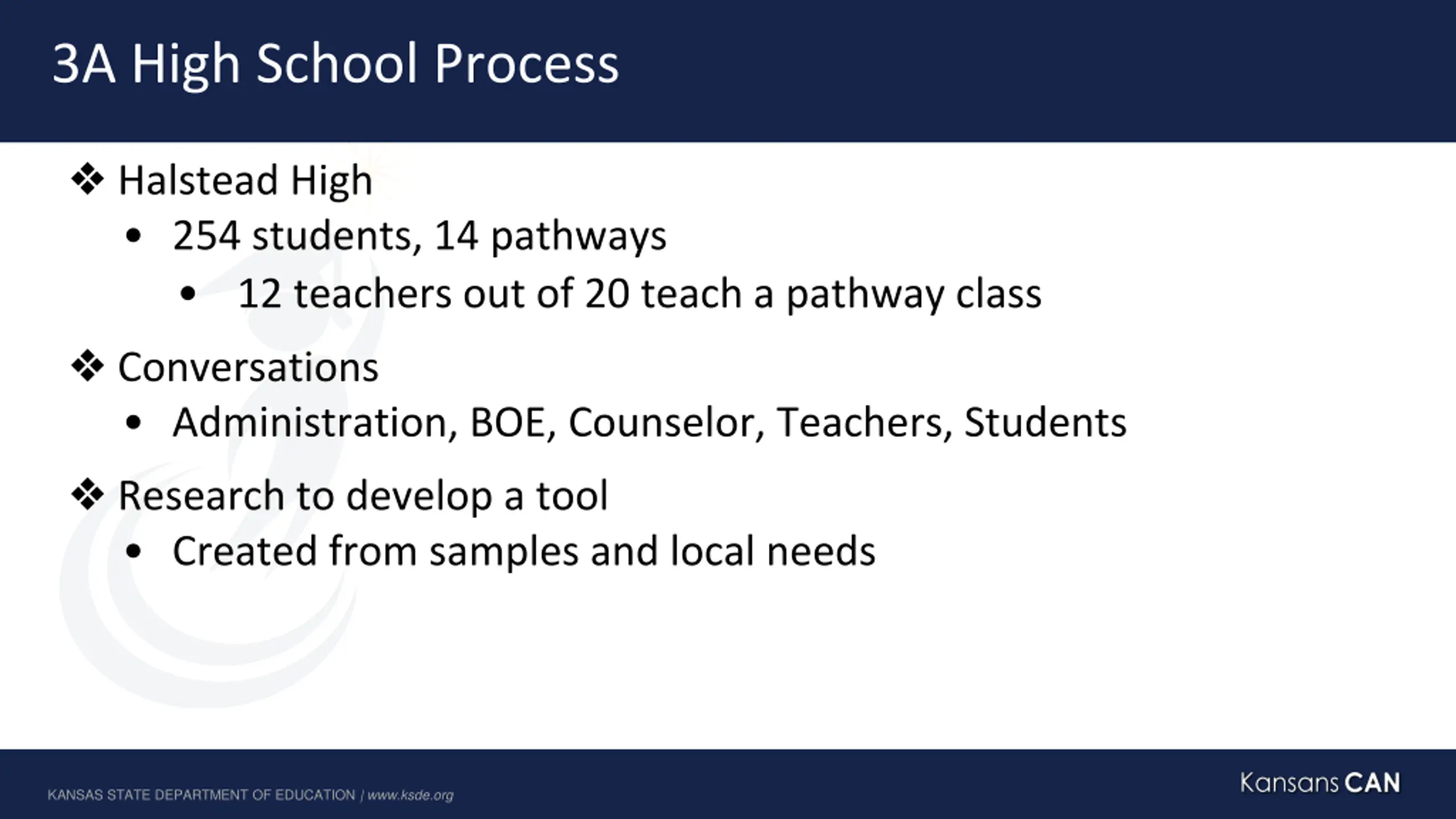 3A High School Process Halstead High 254 students, 14 pathways 12 teachers out of 20 teach a pathway class Conversations Administration, BOE, Counselor, Teachers, Students Research to develop a tool Created from samples and local needs KANSAS STATE DEPARTMENT OF EDUCATION | www.ksde.org