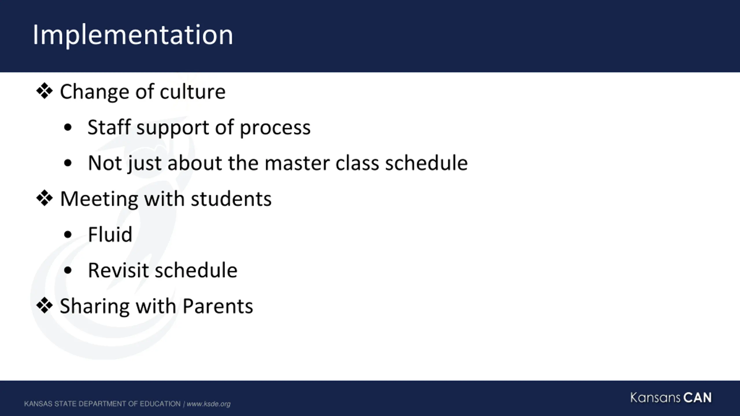 Implementation Change of culture Staff support of process Not just about the master class schedule Meeting with students Fluid Revisit schedule Sharing with Parents KANSAS STATE DEPARTMENT OF EDUCATION | www.ksde.org