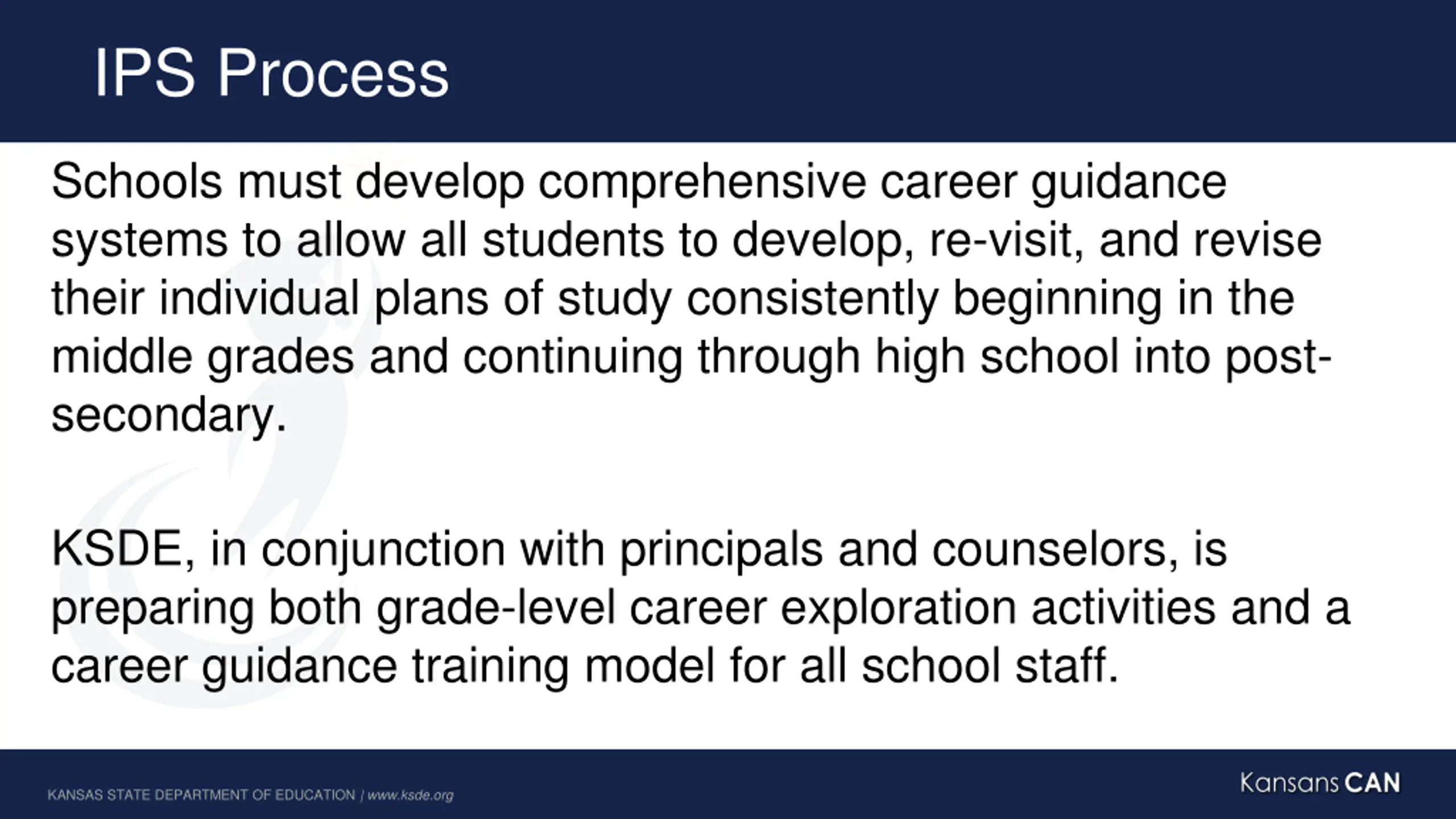 IPS Process Schools must develop comprehensive career guidance systems to allow all students to develop, re-visit, and revise their individual plans of study consistently beginning in the middle grades and continuing through high school into post- secondary. KSDE, in conjunction with principals and counselors, is preparing both grade-level career exploration activities and a career guidance training model for all school staff. KANSAS STATE DEPARTMENT OF EDUCATION | www.ksde.org