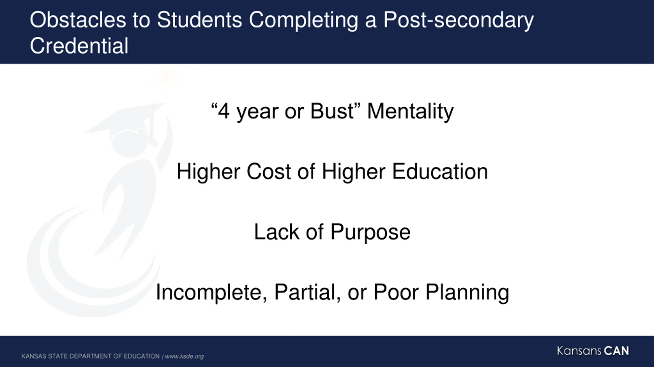 Obstacles to Students Completing a Post-secondary Credential 4 year or Bust Mentality Higher Cost of Higher Education Lack of Purpose Incomplete, Partial, or Poor Planning KANSAS STATE DEPARTMENT OF EDUCATION | www.ksde.org