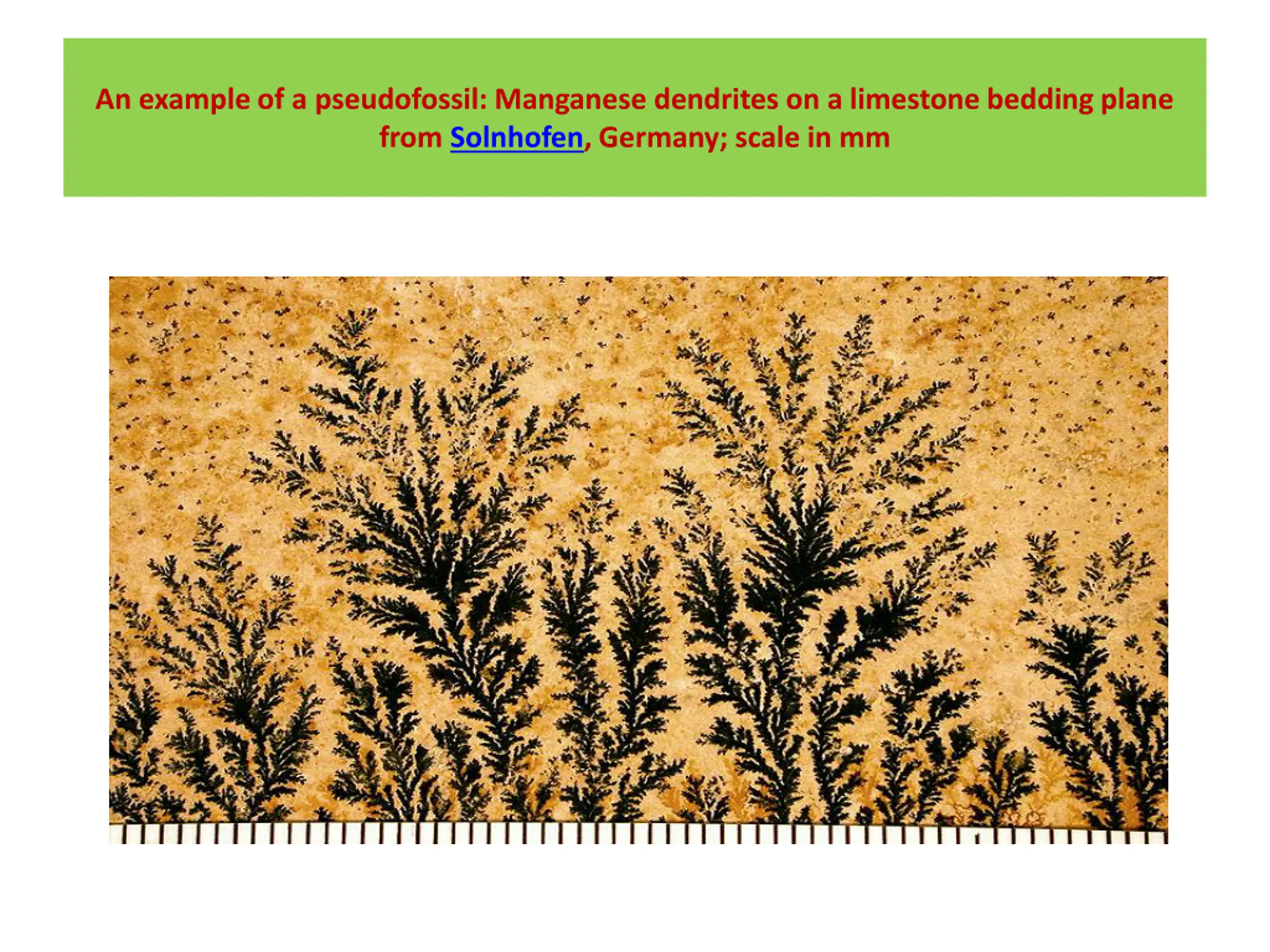 An example of a pseudofossil: Manganese dendrites on a limestone bedding plane from Solnhofen, Germany; scale in mm