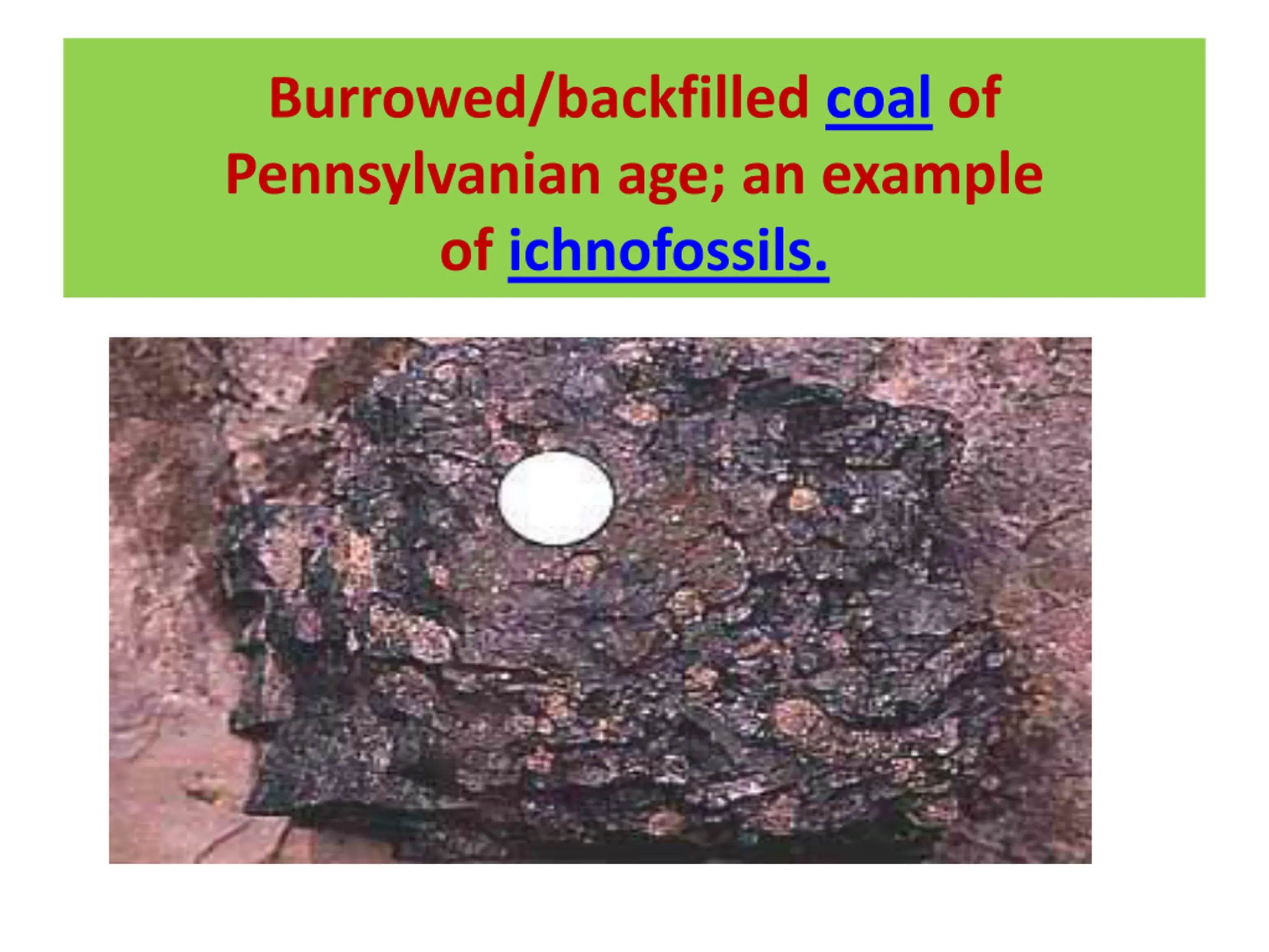 Burrowed/backfilled coal of Pennsylvanian age; an example of ichnofossils.