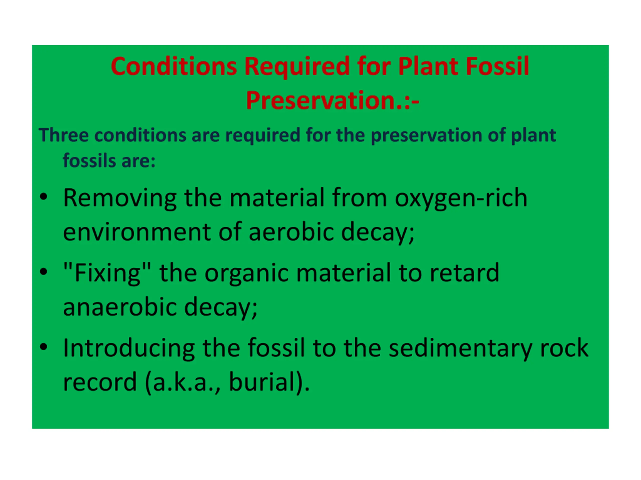 Conditions Required for Plant Fossil Preservation.:- Three conditions are required for the preservation of plant fossils are: Removing the material from oxygen-rich environment of aerobic decay; "Fixing" the organic material to retard anaerobic decay; Introducing the fossil to the sedimentary rock record (a.k.a., burial).
