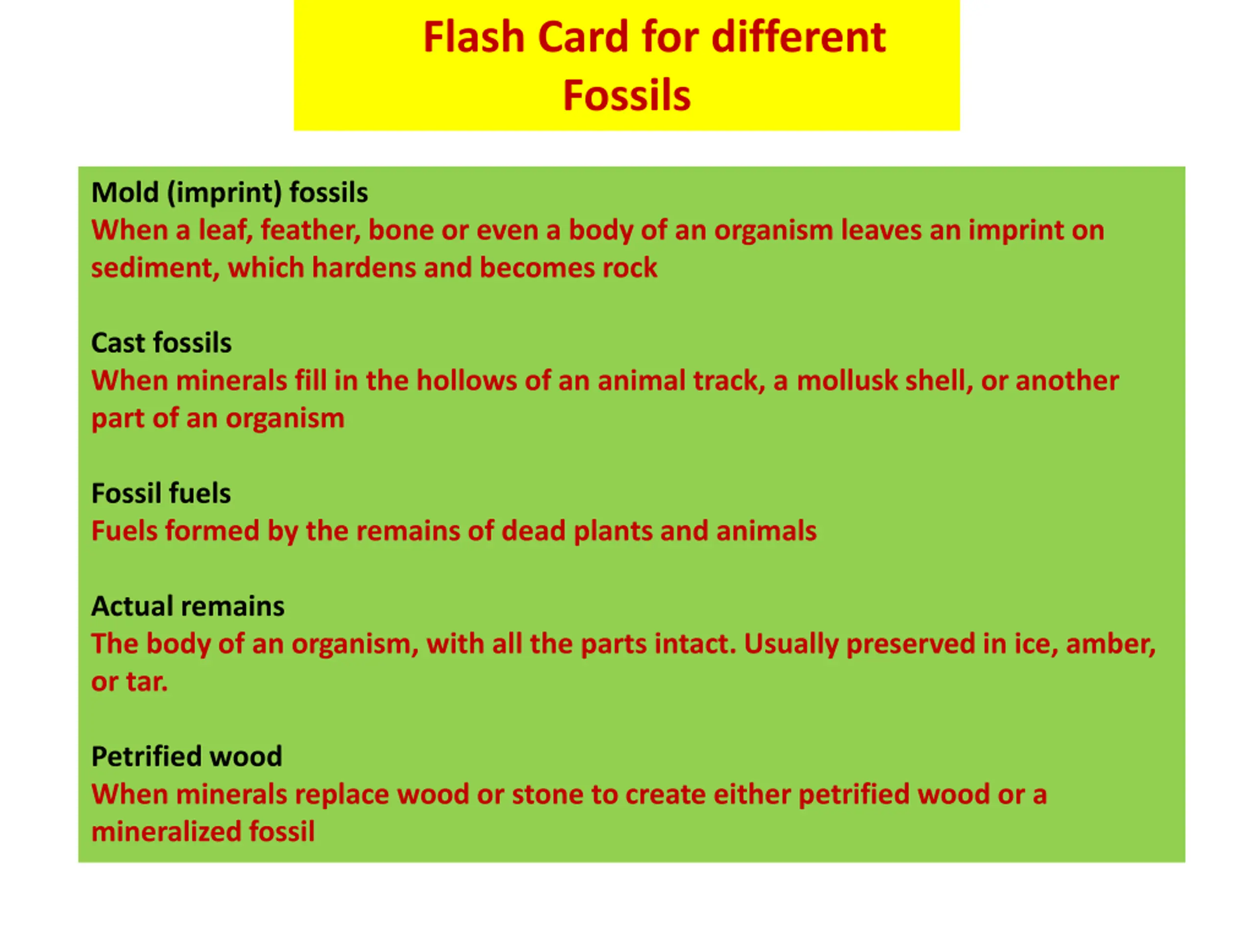 Flash Card for different Fossils Mold (imprint) fossils When a leaf, feather, bone or even a body of an organism leaves an imprint on sediment, which hardens and becomes rock Cast fossils When minerals fill in the hollows of an animal track, a mollusk shell, or another part of an organism Fossil fuels Fuels formed by the remains of dead plants and animals Actual remains The body of an organism, with all the parts intact. Usually preserved in ice, amber, or tar. Petrified wood When minerals replace wood or stone to create either petrified wood or a mineralized fossil