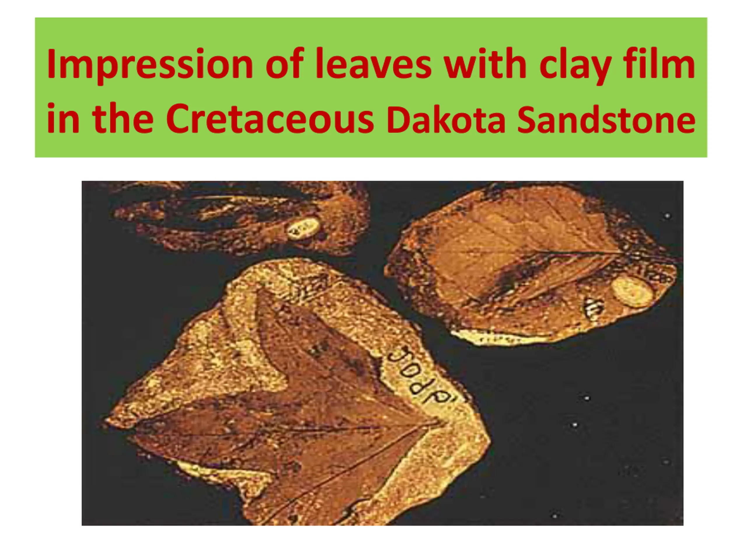 Impression of leaves with clay film in the Cretaceous Dakota Sandstone