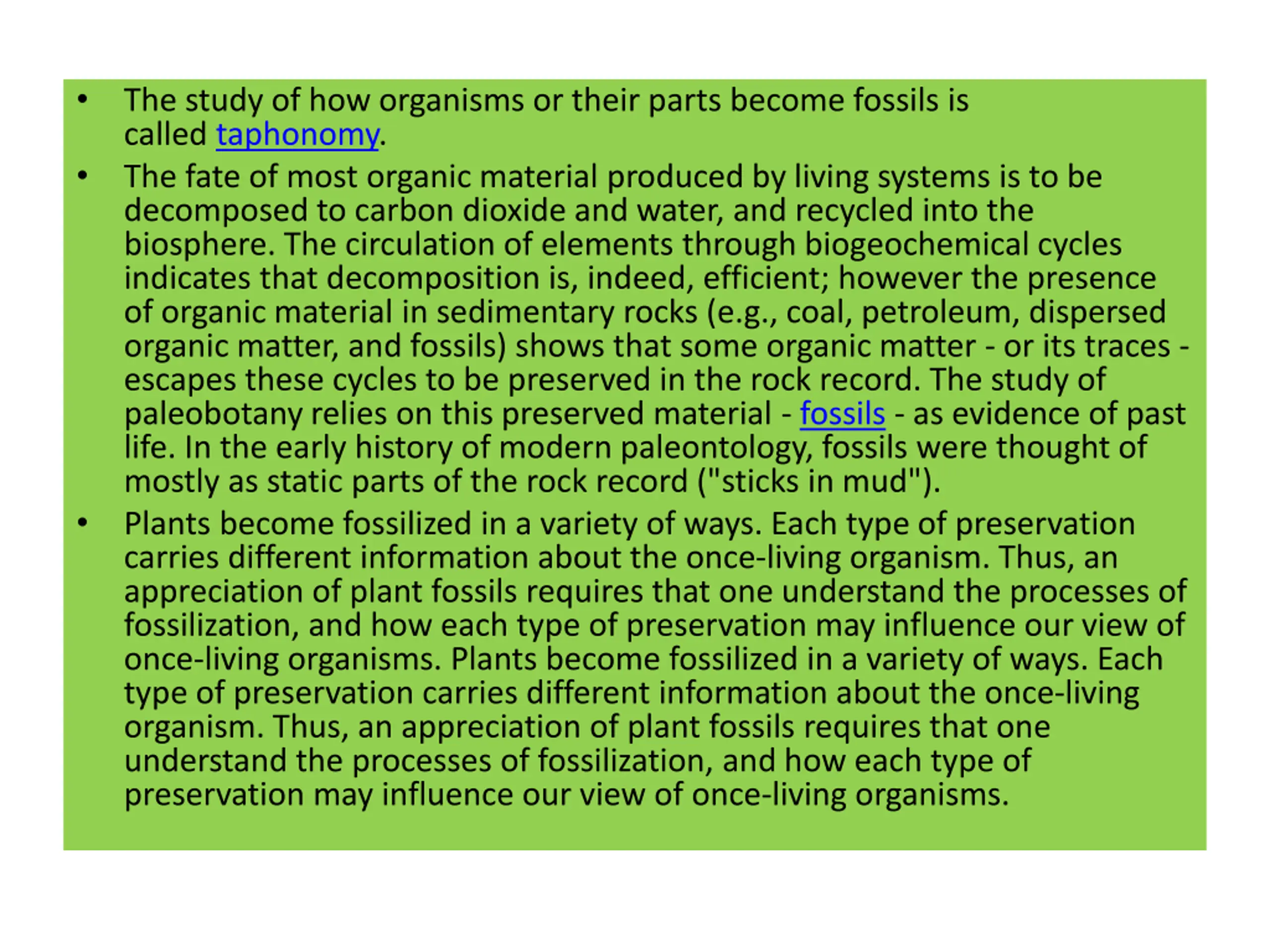 The study of how organisms or their parts become fossils is called taphonomy. The fate of most organic material produced by living systems is to be decomposed to carbon dioxide and water, and recycled into the biosphere. The circulation of elements through biogeochemical cycles indicates that decomposition is, indeed, efficient; however the presence of organic material in sedimentary rocks (e.g., coal, petroleum, dispersed organic matter, and fossils) shows that some organic matter - or its traces - escapes these cycles to be preserved in the rock record. The study of paleobotany relies on this preserved material - fossils - as evidence of past life. In the early history of modern paleontology, fossils were thought of mostly as static parts of the rock record ("sticks in mud"). Plants become fossilized in a variety of ways. Each type of preservation carries different information about the once-living organism. Thus, an appreciation of plant fossils requires that one understand the processes of fossilization, and how each type of preservation may influence our view of once-living organisms. Plants become fossilized in a variety of ways. Each type of preservation carries different information about the once-living organism. Thus, an appreciation of plant fossils requires that one understand the processes of fossilization, and how each type of preservation may influence our view of once-living organisms.