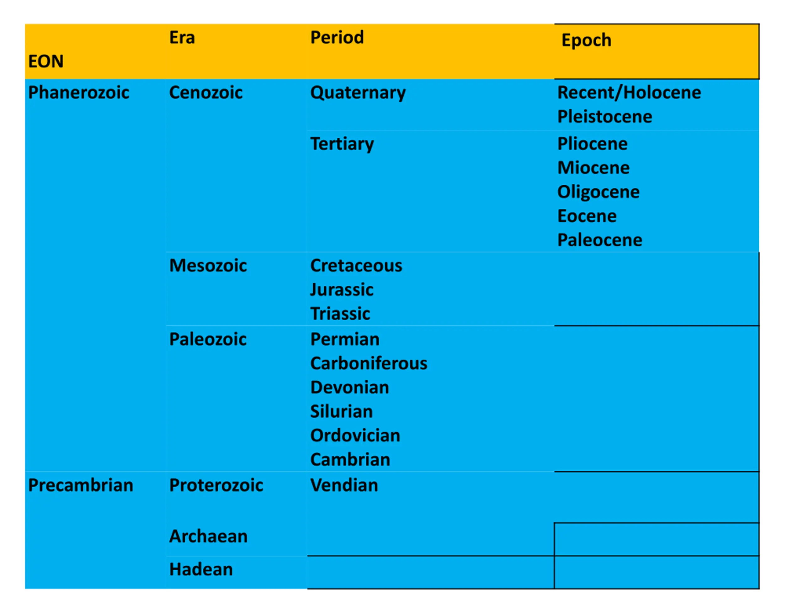 Era Period Epoch EON Phanerozoic Cenozoic Quaternary Recent/Holocene Pleistocene Pliocene Miocene Oligocene Eocene Paleocene Tertiary Mesozoic Cretaceous Jurassic Triassic Permian Carboniferous Devonian Silurian Ordovician Cambrian Vendian Paleozoic Precambrian Proterozoic Archaean Hadean