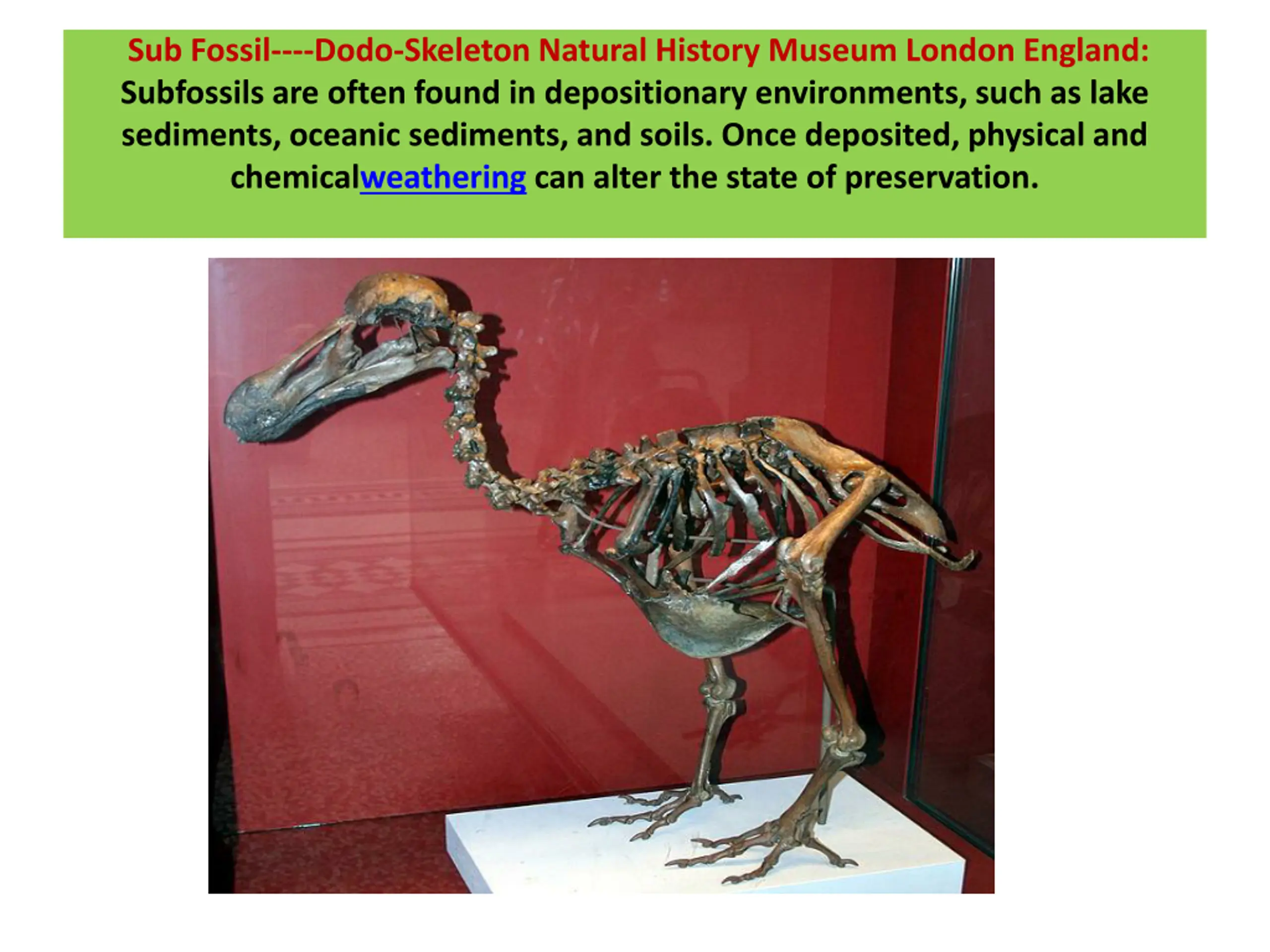 Sub Fossil----Dodo-Skeleton Natural History Museum London England: Subfossils are often found in depositionary environments, such as lake sediments, oceanic sediments, and soils. Once deposited, physical and chemicalweathering can alter the state of preservation.
