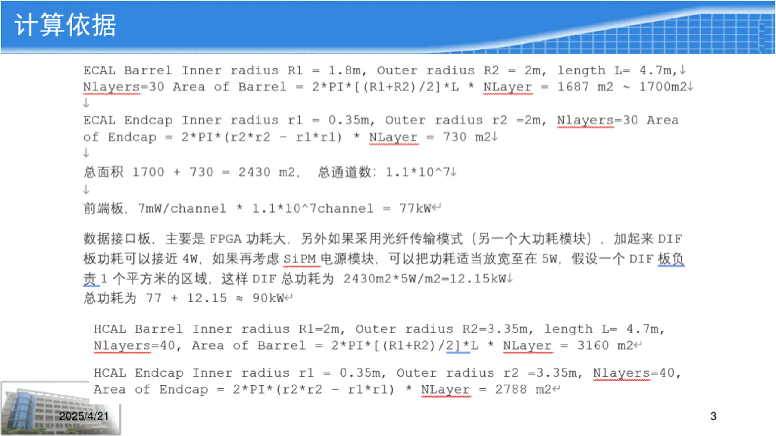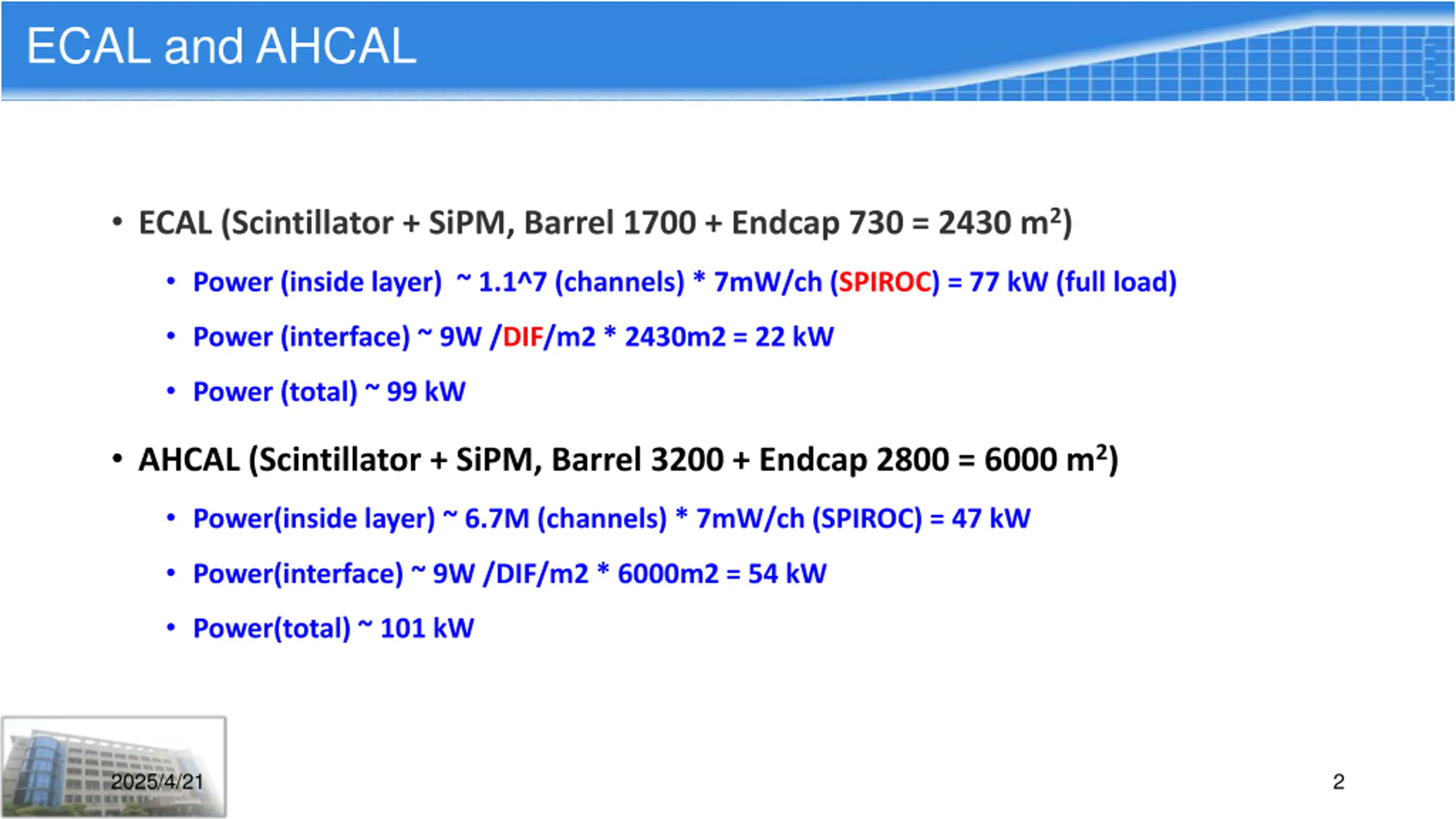 ECAL and AHCAL ECAL (Scintillator + SiPM, Barrel 1700 + Endcap 730 = 2430 m2) Power (inside layer) ~ 1.1^7 (channels) * 7mW/ch (SPIROC) = 77 kW (full load) Power (interface) ~ 9W /DIF/m2 * 2430m2 = 22 kW Power (total) ~ 99 kW AHCAL (Scintillator + SiPM, Barrel 3200 + Endcap 2800 = 6000 m2) Power(inside layer) ~ 6.7M (channels) * 7mW/ch (SPIROC) = 47 kW Power(interface) ~ 9W /DIF/m2 * 6000m2 = 54 kW Power(total) ~ 101 kW 2025/4/21 2