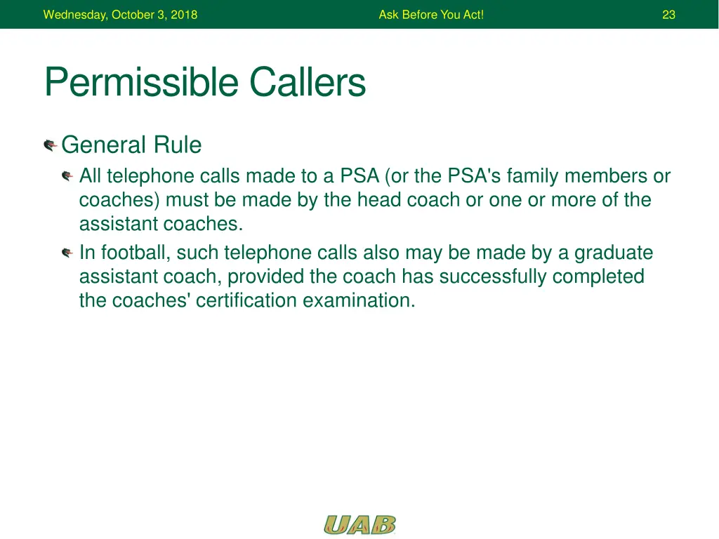 Wednesday, October 3, 2018 Ask Before You Act! 23 Permissible Callers General Rule All telephone calls made to a PSA (or the PSA's family members or coaches) must be made by the head coach or one or more of the assistant coaches. In football, such telephone calls also may be made by a graduate assistant coach, provided the coach has successfully completed the coaches' certification examination.