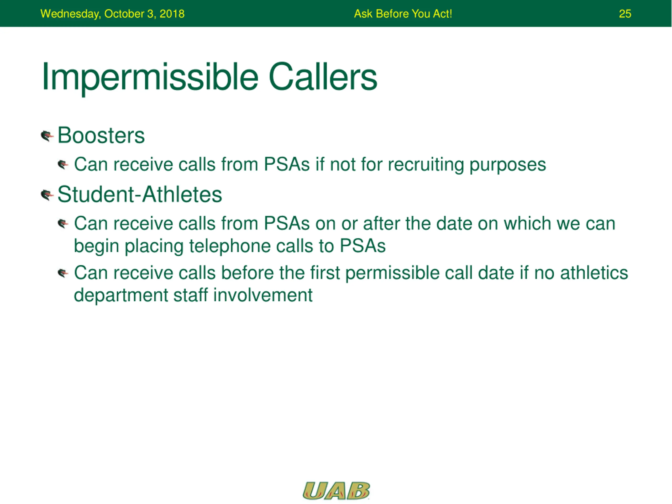 Wednesday, October 3, 2018 Ask Before You Act! 25 Impermissible Callers Boosters Can receive calls from PSAs if not for recruiting purposes Student-Athletes Can receive calls from PSAs on or after the date on which we can begin placing telephone calls to PSAs Can receive calls before the first permissible call date if no athletics department staff involvement