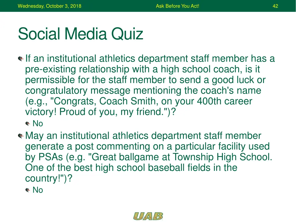 Wednesday, October 3, 2018 Ask Before You Act! 42 Social Media Quiz If an institutional athletics department staff member has a pre-existing relationship with a high school coach, is it permissible for the staff member to send a good luck or congratulatory message mentioning the coach's name (e.g., "Congrats, Coach Smith, on your 400th career victory! Proud of you, my friend.")? No May an institutional athletics department staff member generate a post commenting on a particular facility used by PSAs (e.g. "Great ballgame at Township High School. One of the best high school baseball fields in the country!")? No