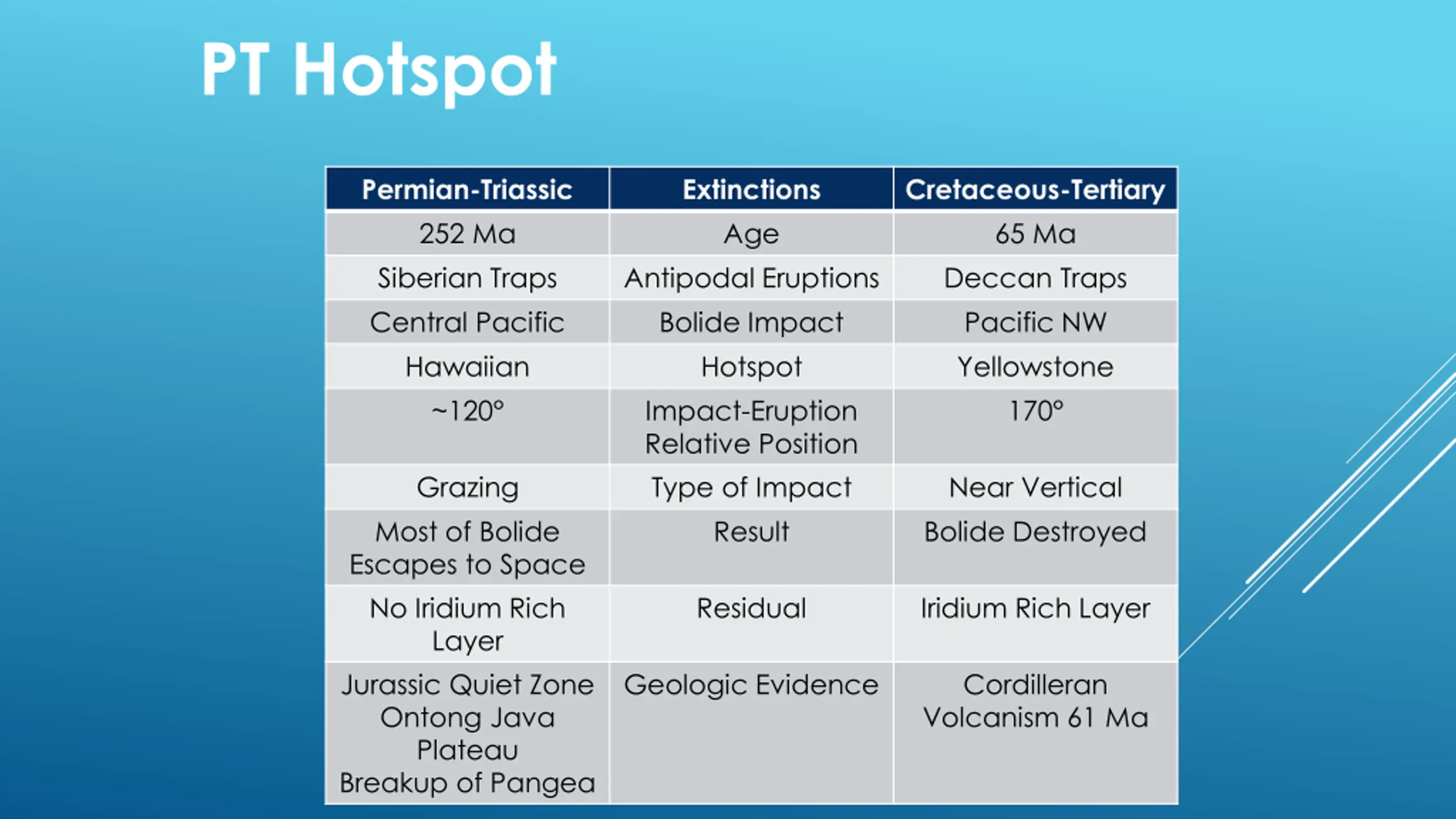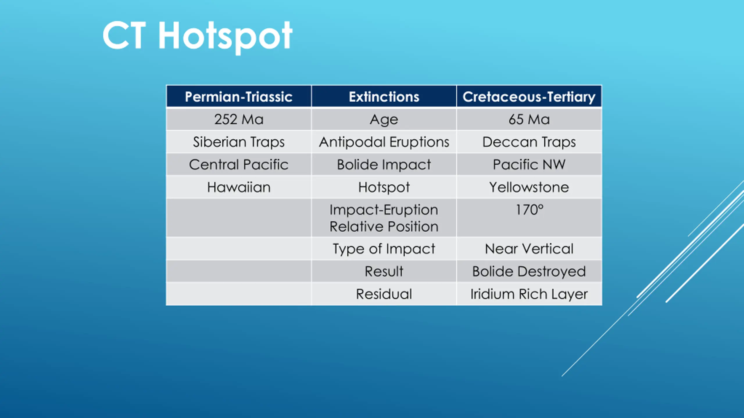CT Hotspot Permian-Triassic 252 Ma Siberian Traps Central Pacific Hawaiian Extinctions Age Antipodal Eruptions Bolide Impact Hotspot Impact-Eruption Relative Position Type of Impact Result Residual Cretaceous-Tertiary 65 Ma Deccan Traps Pacific NW Yellowstone 170 Near Vertical Bolide Destroyed Iridium Rich Layer