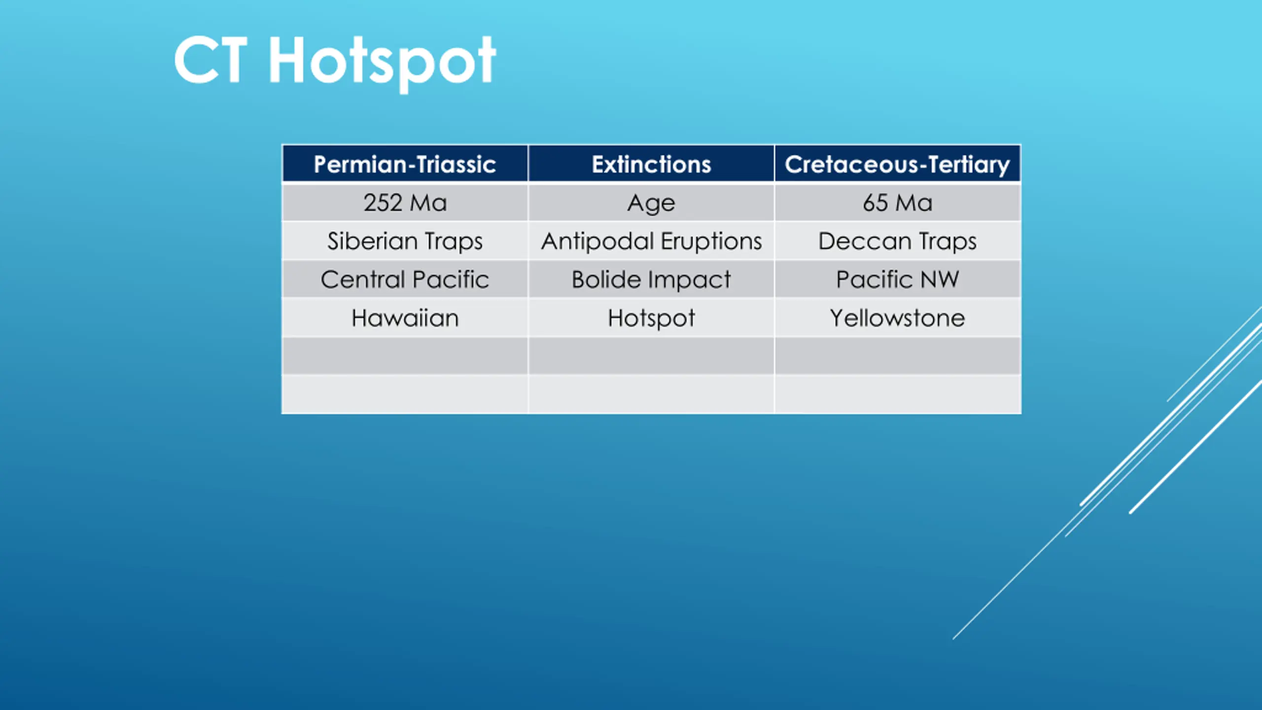 CT Hotspot Permian-Triassic 252 Ma Siberian Traps Central Pacific Hawaiian Extinctions Age Antipodal Eruptions Bolide Impact Hotspot Cretaceous-Tertiary 65 Ma Deccan Traps Pacific NW Yellowstone