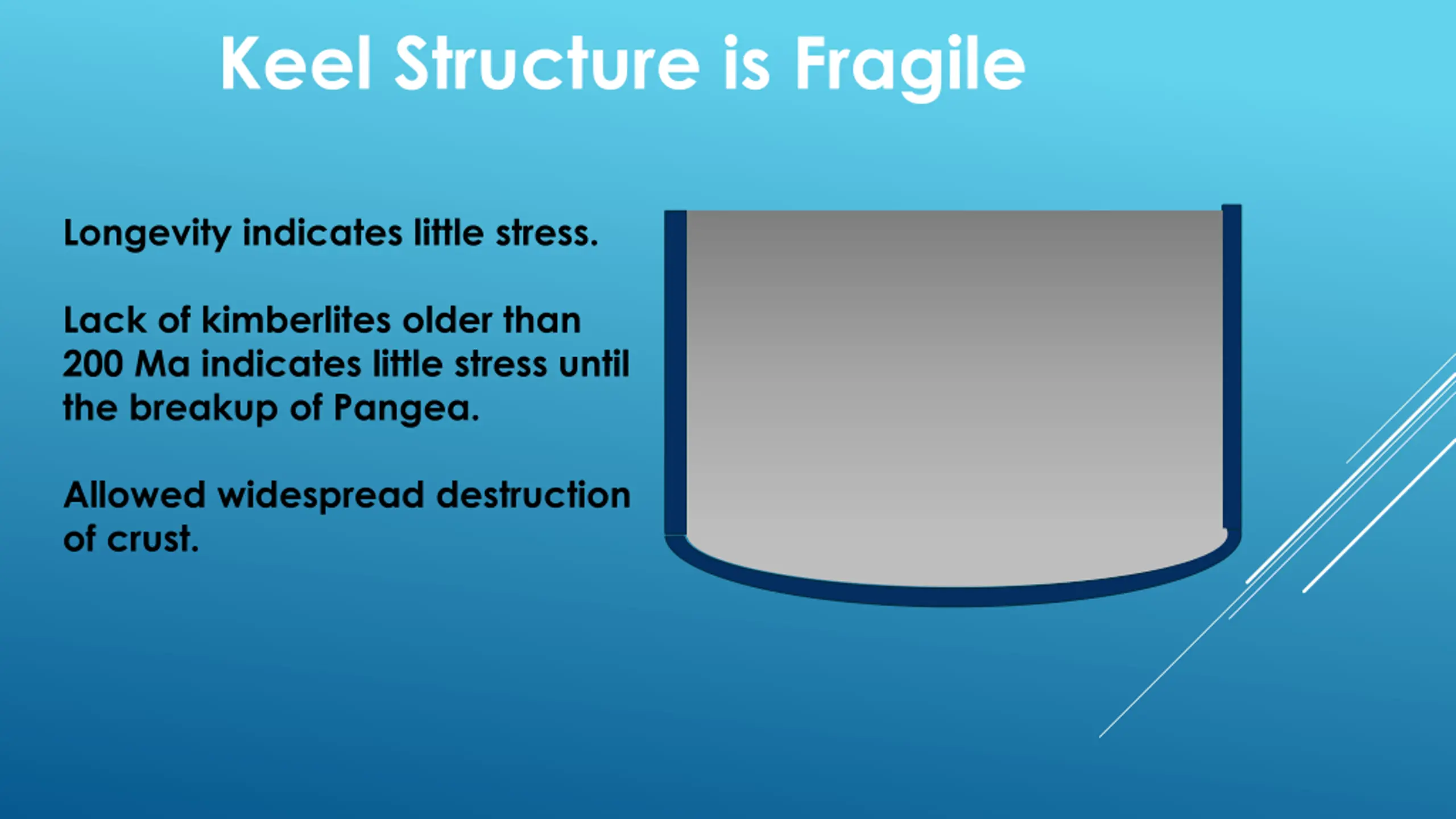 Keel Structure is Fragile Longevity indicates little stress. Lack of kimberlites older than 200 Ma indicates little stress until the breakup of Pangea. Allowed widespread destruction of crust.