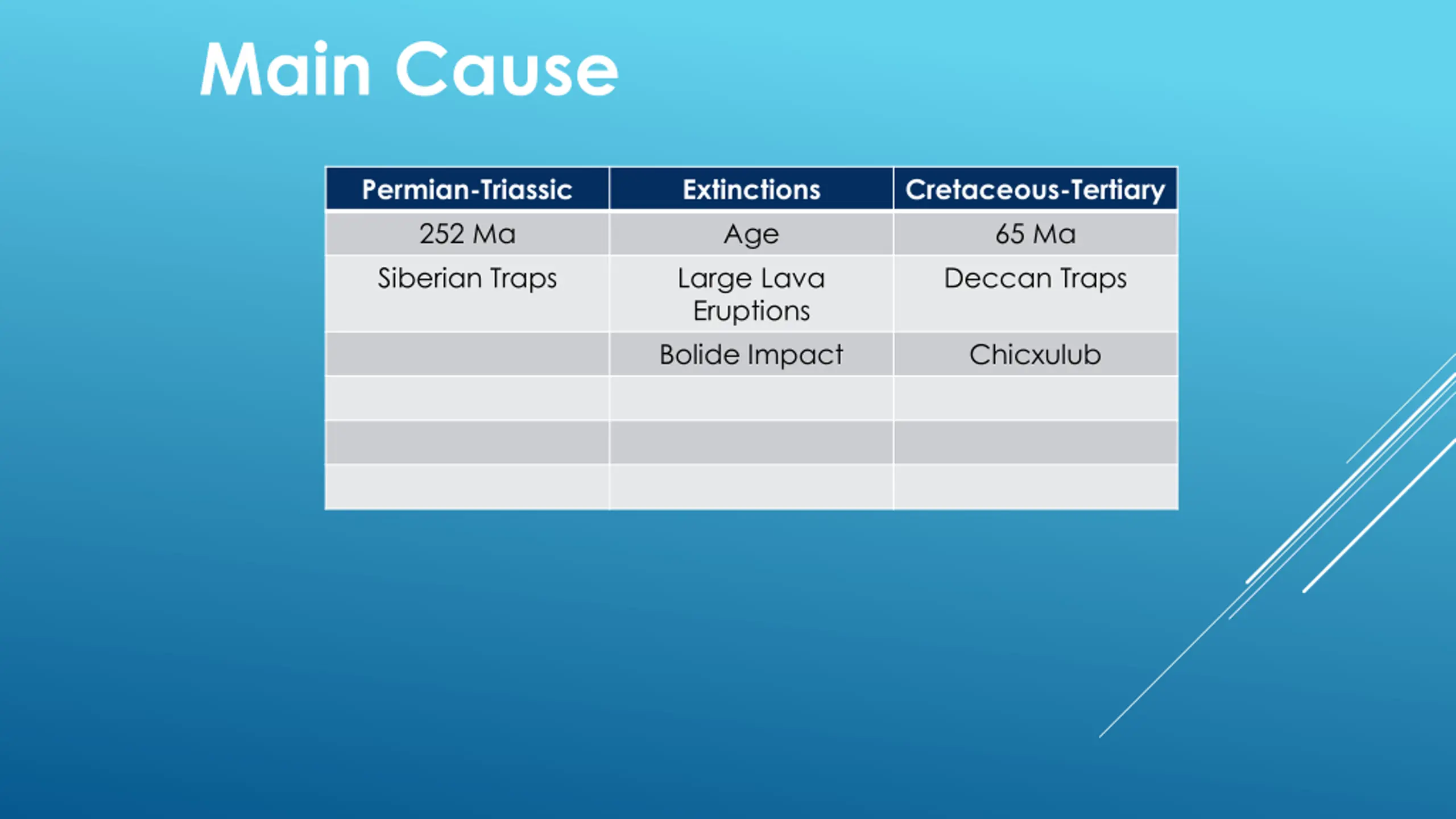 Main Cause Permian-Triassic 252 Ma Siberian Traps Extinctions Age Large Lava Eruptions Bolide Impact Cretaceous-Tertiary 65 Ma Deccan Traps Chicxulub