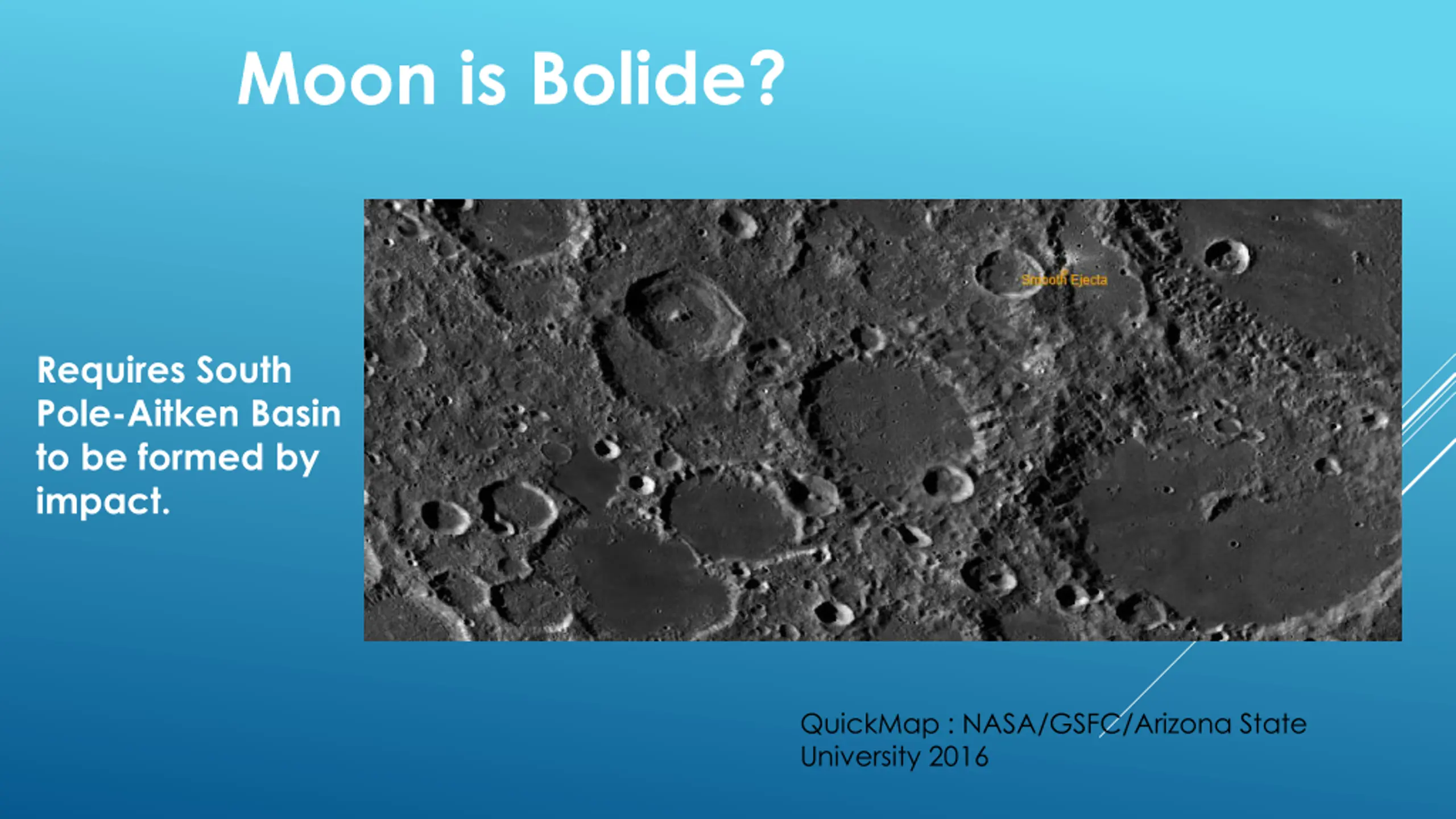 Moon is Bolide? Requires South Pole-Aitken Basin to be formed by impact. QuickMap : NASA/GSFC/Arizona State University 2016