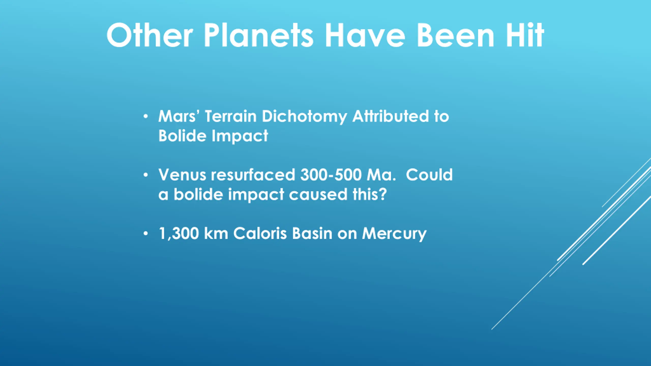 Other Planets Have Been Hit Mars Terrain Dichotomy Attributed to Bolide Impact Venus resurfaced 300-500 Ma. Could a bolide impact caused this? 1,300 km Caloris Basin on Mercury