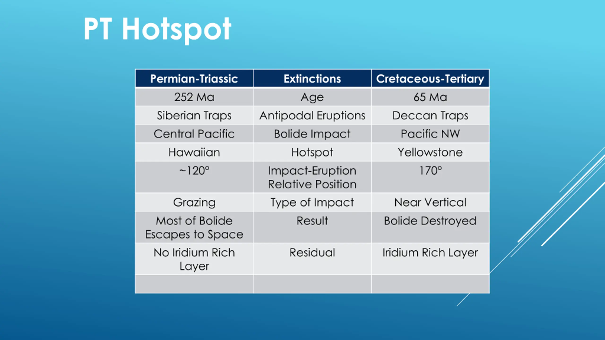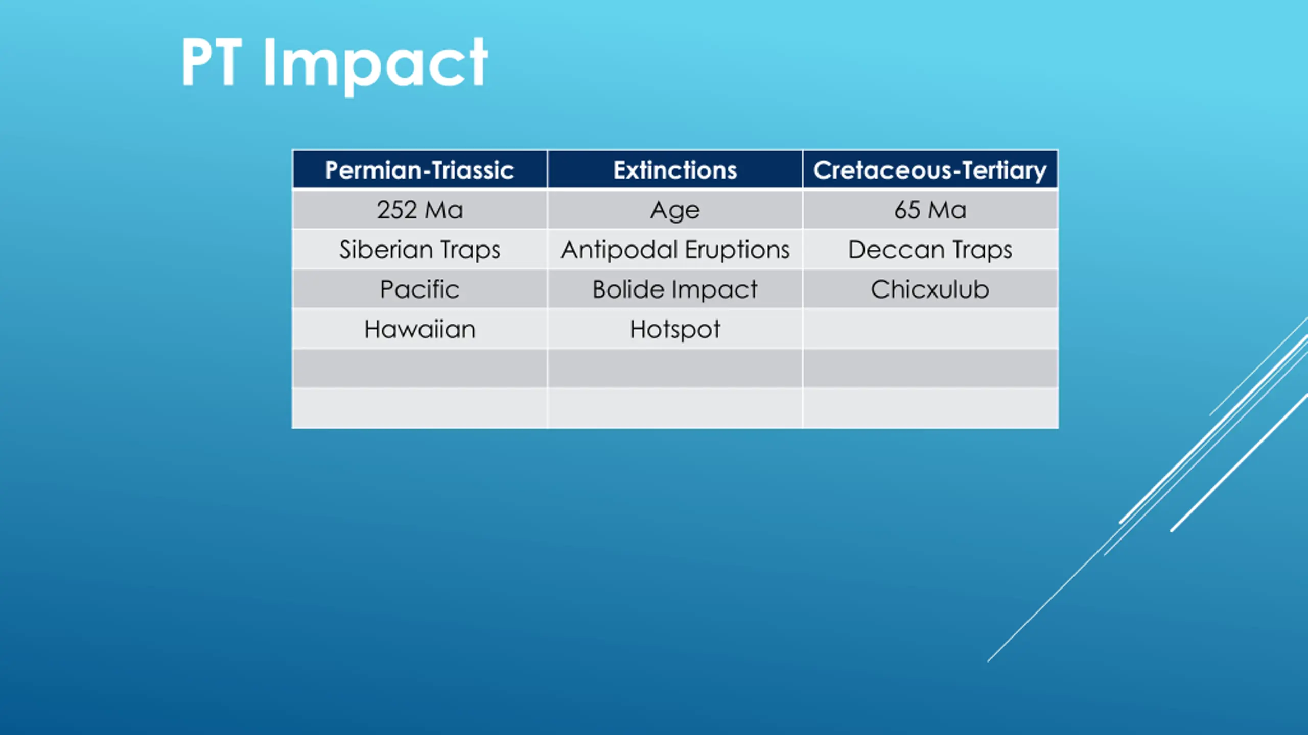 PT Impact Permian-Triassic 252 Ma Siberian Traps Pacific Hawaiian Extinctions Age Antipodal Eruptions Bolide Impact Hotspot Cretaceous-Tertiary 65 Ma Deccan Traps Chicxulub