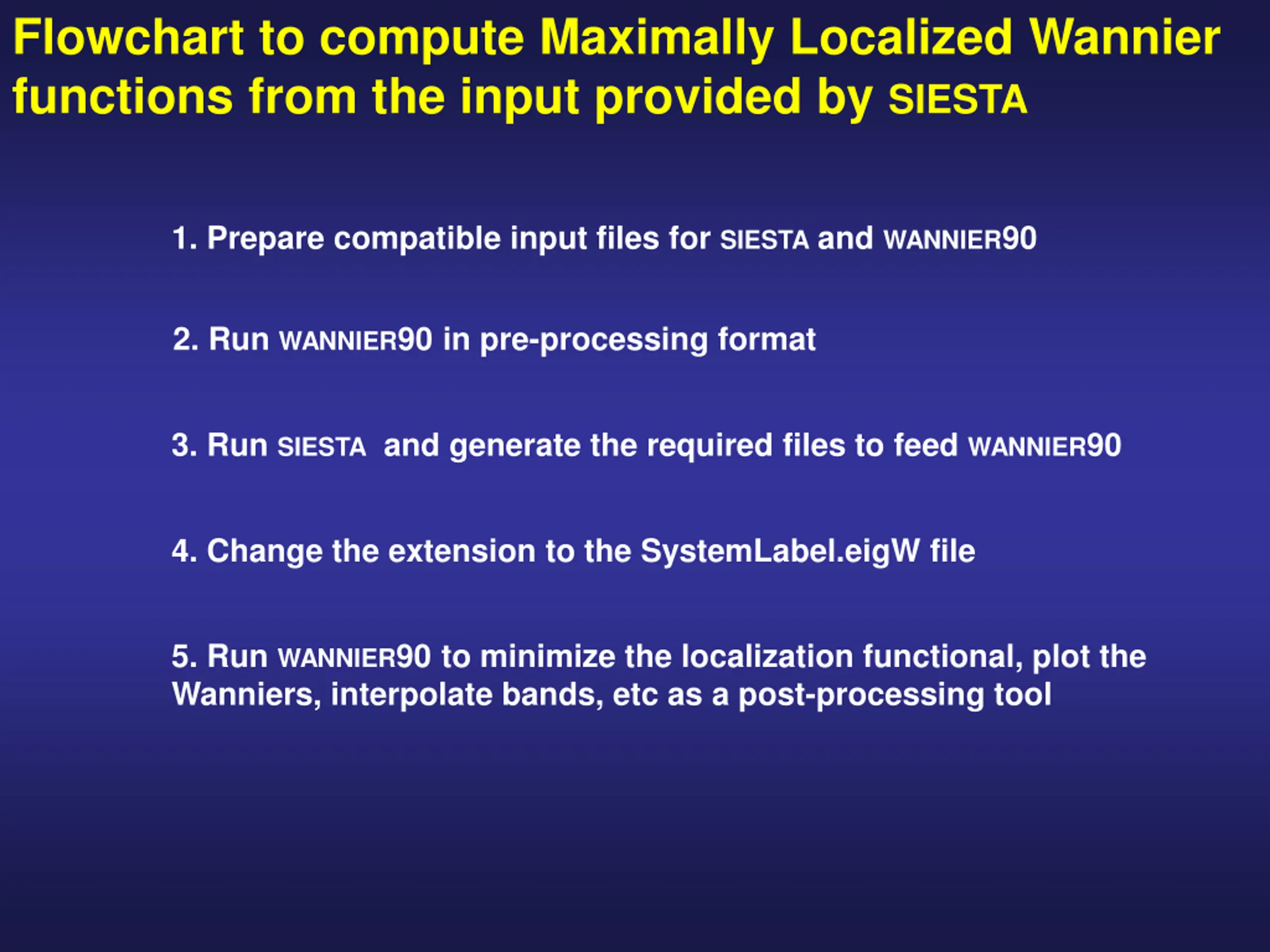Flowchart to compute Maximally Localized Wannier functions from the input provided by SIESTA 1. Prepare compatible input files for SIESTA and WANNIER90 2. Run WANNIER90 in pre-processing format 3. Run SIESTA and generate the required files to feed WANNIER90 4. Change the extension to the SystemLabel.eigW file 5. Run WANNIER90 to minimize the localization functional, plot the Wanniers, interpolate bands, etc as a post-processing tool