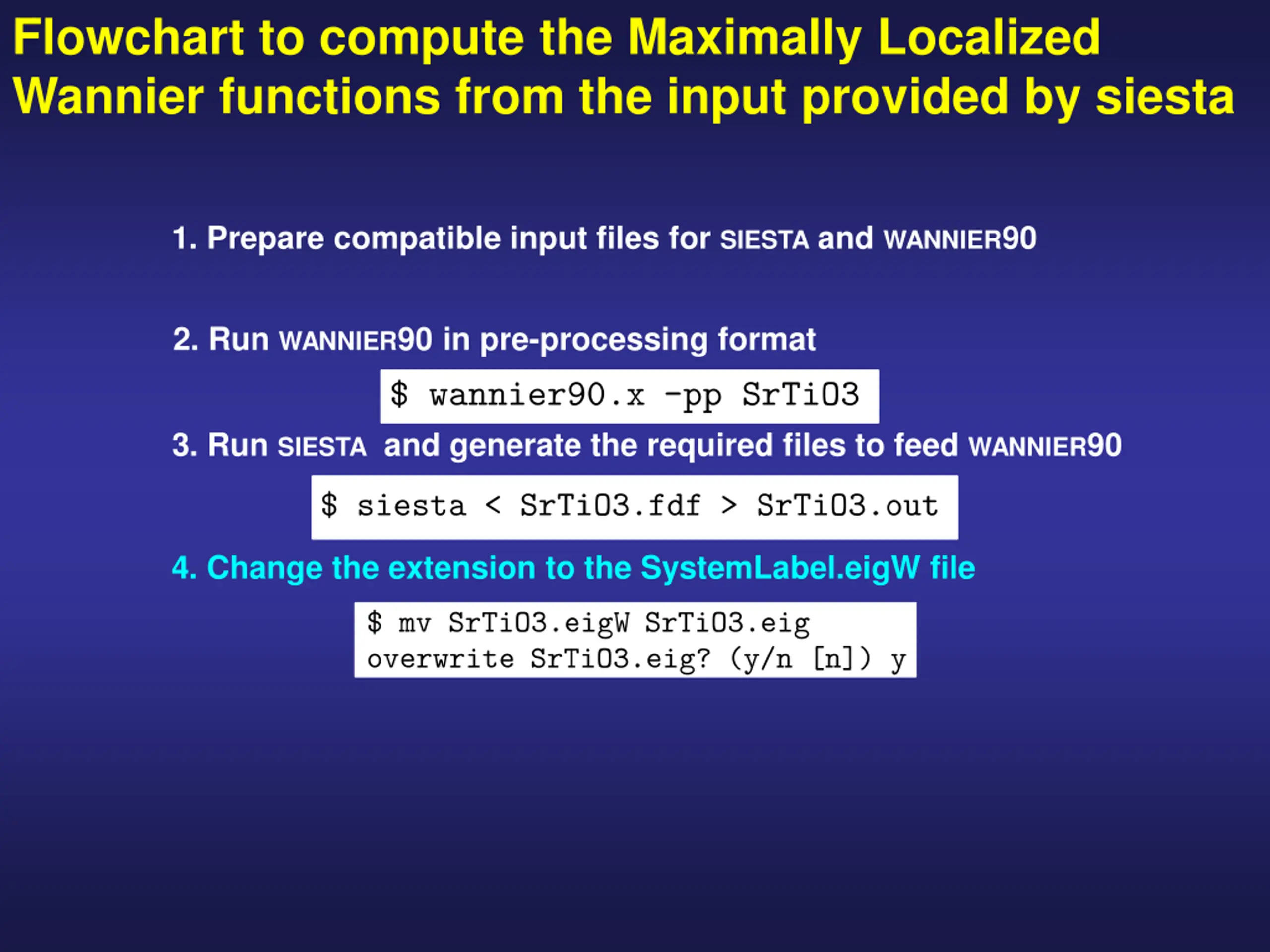 Flowchart to compute the Maximally Localized Wannier functions from the input provided by siesta 1. Prepare compatible input files for SIESTA and WANNIER90 2. Run WANNIER90 in pre-processing format 3. Run SIESTA and generate the required files to feed WANNIER90 4. Change the extension to the SystemLabel.eigW file