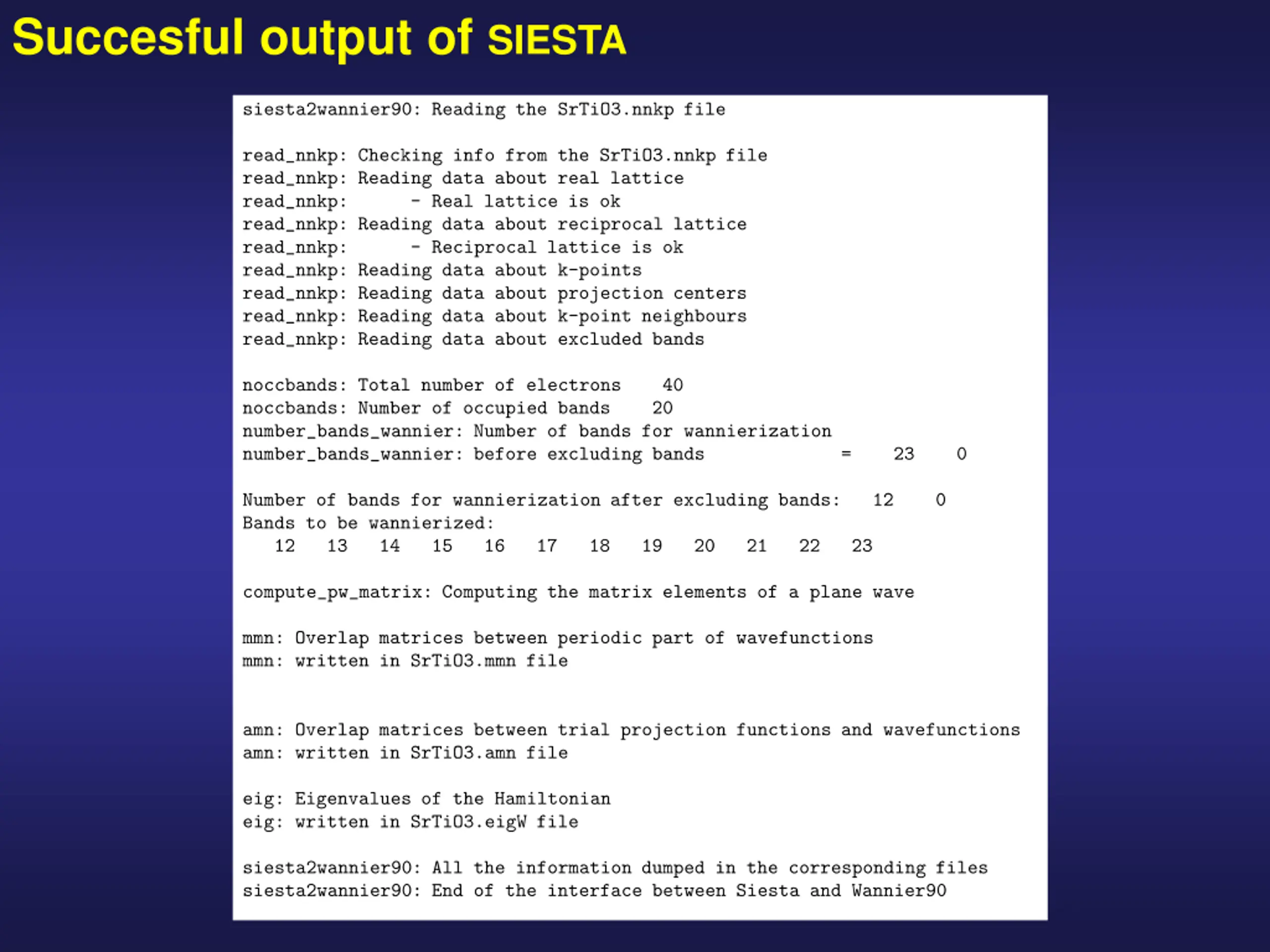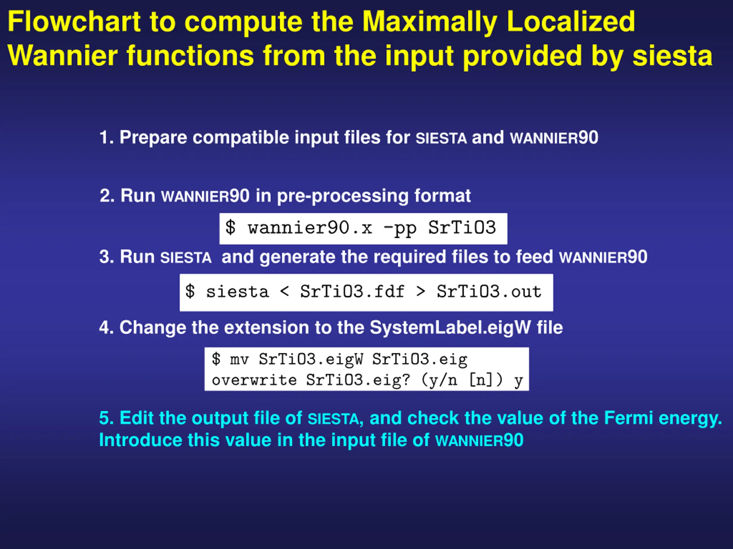 Flowchart to compute Maximally Localized Wannier functions from the input provided by SIESTA 1. Prepare compatible input files for SIESTA and WANNIER90 2. Run WANNIER90 in pre-processing format This generates a seedname.nnkp file that is digested by SIESTA