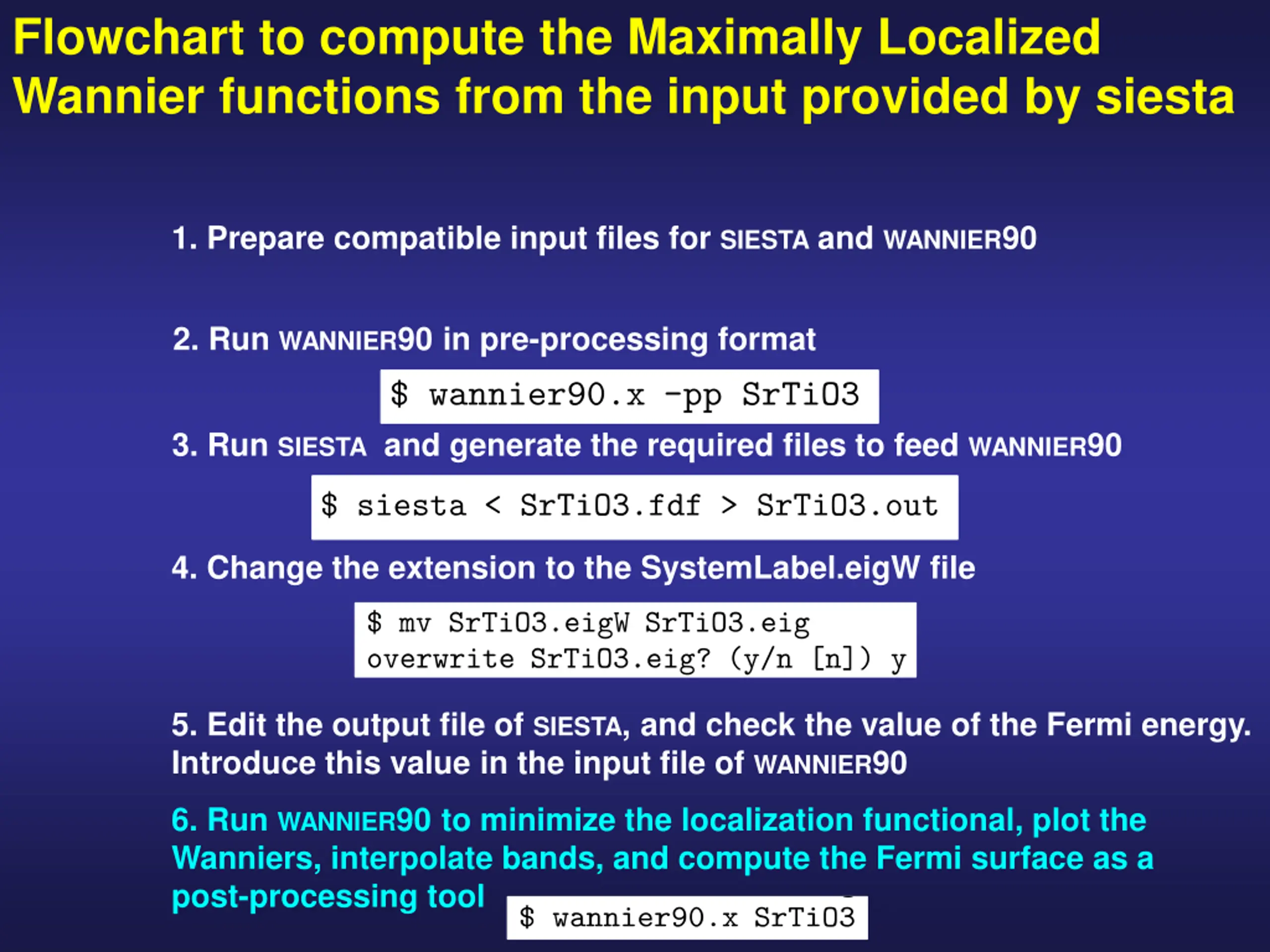 Flowchart to compute the Maximally Localized Wannier functions from the input provided by siesta 1. Prepare compatible input files for SIESTA and WANNIER90 2. Run WANNIER90 in pre-processing format 3. Run SIESTA and generate the required files to feed WANNIER90 4. Change the extension to the SystemLabel.eigW file 5. Edit the output file of SIESTA, and check the value of the Fermi energy. Introduce this value in the input file of WANNIER90 6. Run WANNIER90 to minimize the localization functional, plot the Wanniers, interpolate bands, and compute the Fermi surface as a post-processing tool