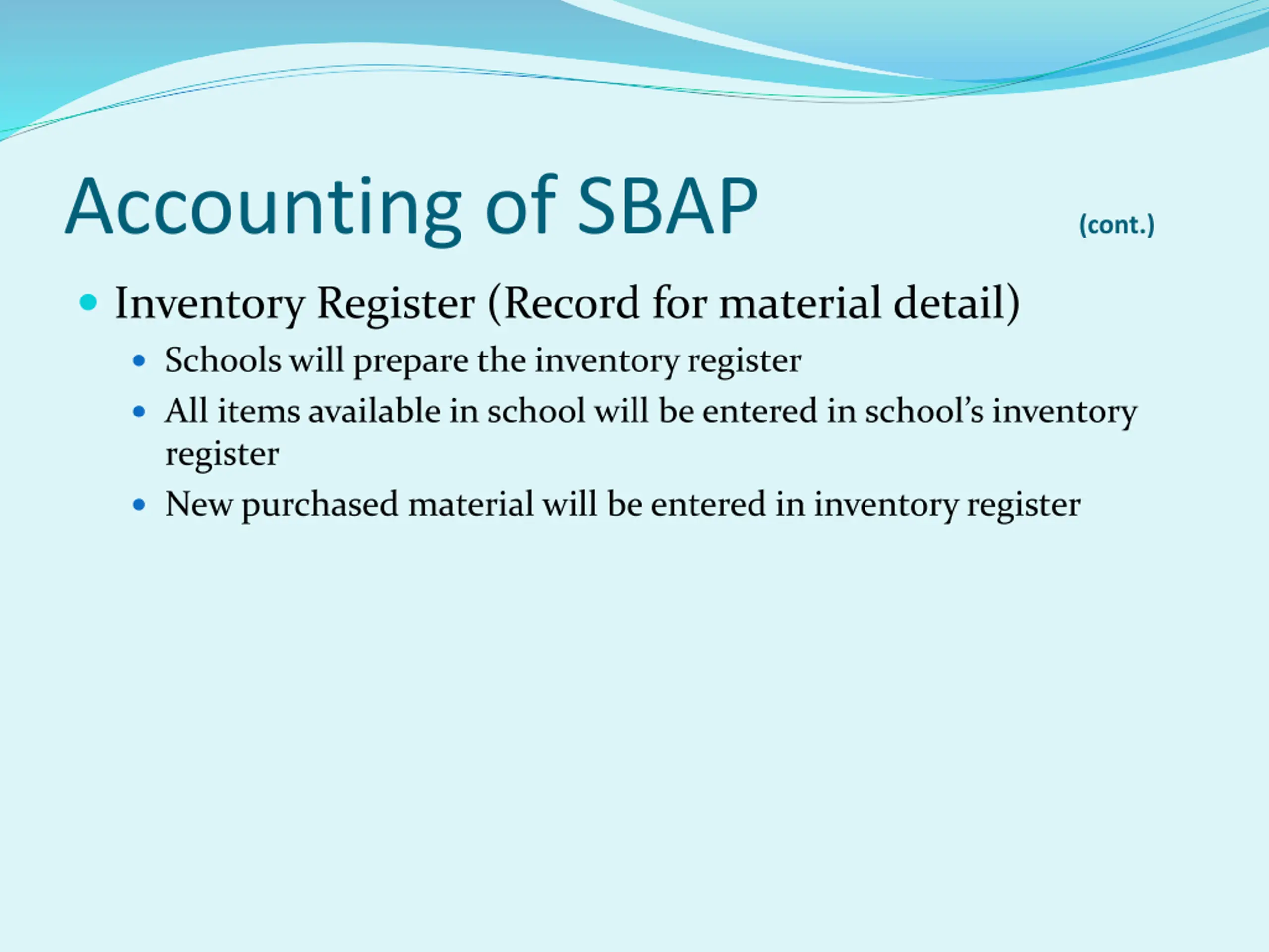 Accounting of SBAP (cont.) Inventory Register (Record for material detail) Schools will prepare the inventory register All items available in school will be entered in school s inventory register New purchased material will be entered in inventory register