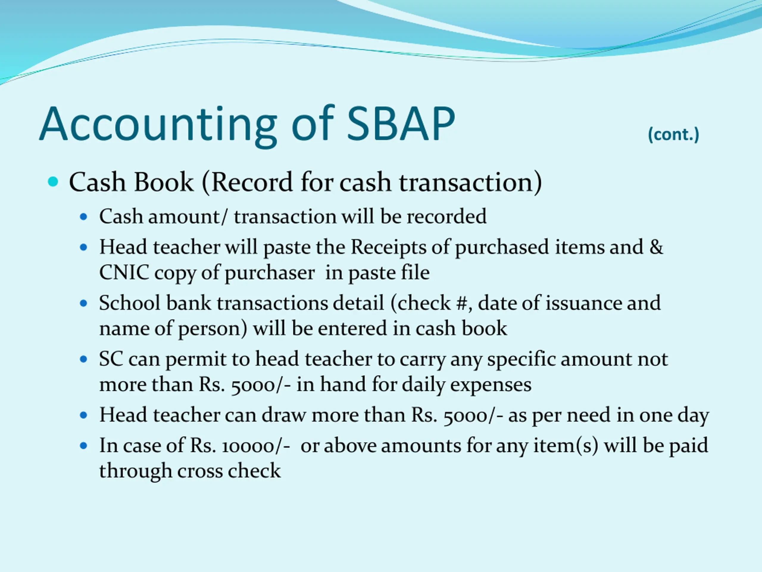 Accounting of SBAP (cont.) Cash Book (Record for cash transaction) Cash amount/ transaction will be recorded Head teacher will paste the Receipts of purchased items and & CNIC copy of purchaser in paste file School bank transactions detail (check #, date of issuance and name of person) will be entered in cash book SC can permit to head teacher to carry any specific amount not more than Rs. 5000/- in hand for daily expenses Head teacher can draw more than Rs. 5000/- as per need in one day In case of Rs. 10000/- or above amounts for any item(s) will be paid through cross check