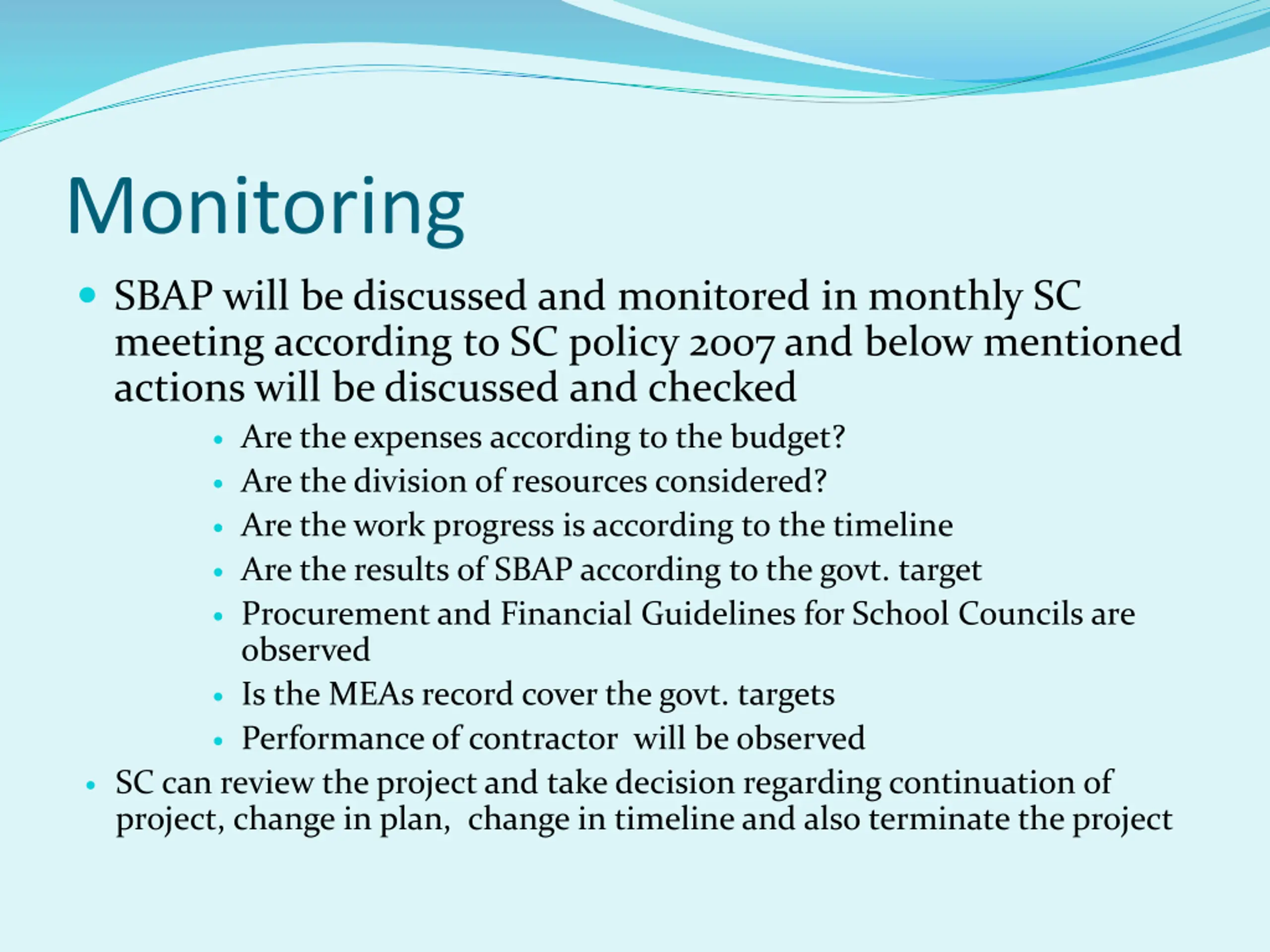 Monitoring SBAP will be discussed and monitored in monthly SC meeting according to SC policy 2007 and below mentioned actions will be discussed and checked Are the expenses according to the budget? Are the division of resources considered? Are the work progress is according to the timeline Are the results of SBAP according to the govt. target Procurement and Financial Guidelines for School Councils are observed Is the MEAs record cover the govt. targets Performance of contractor will be observed SC can review the project and take decision regarding continuation of project, change in plan, change in timeline and also terminate the project