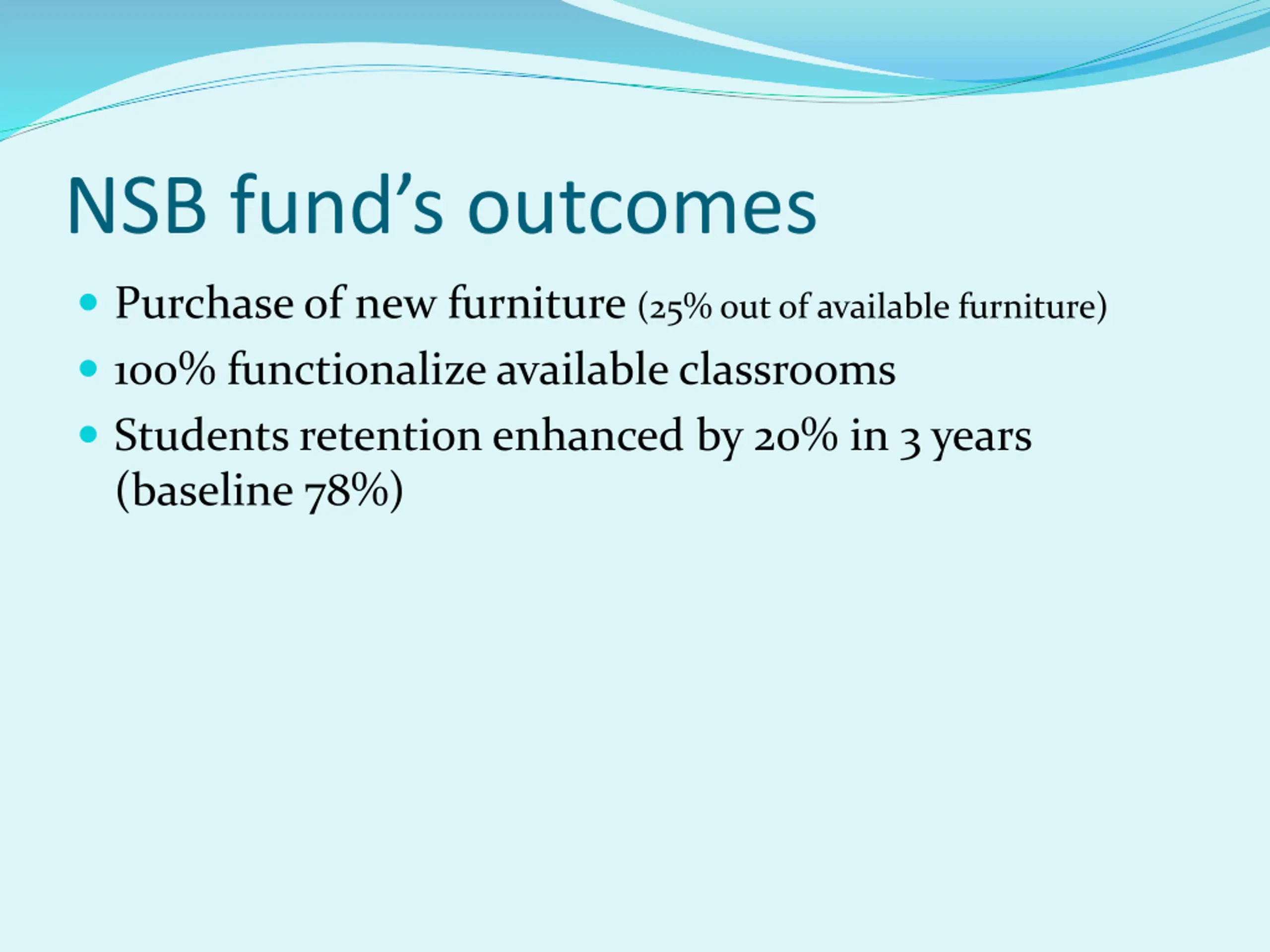 NSB funds outcomes Purchase of new furniture (25% out of available furniture) 100% functionalize available classrooms Students retention enhanced by 20% in 3 years (baseline 78%)