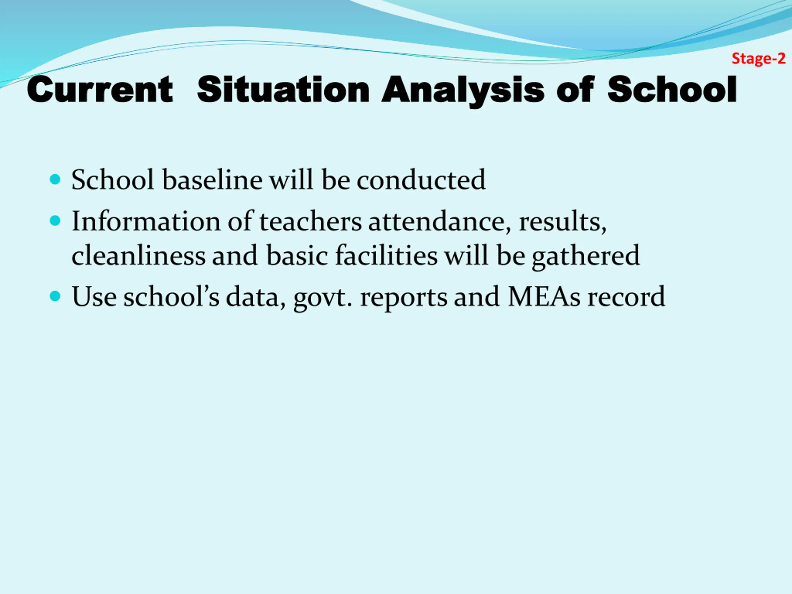 Stage-2 Current Situation Analysis of School Current Situation Analysis of School School baseline will be conducted Information of teachers attendance, results, cleanliness and basic facilities will be gathered Use school s data, govt. reports and MEAs record