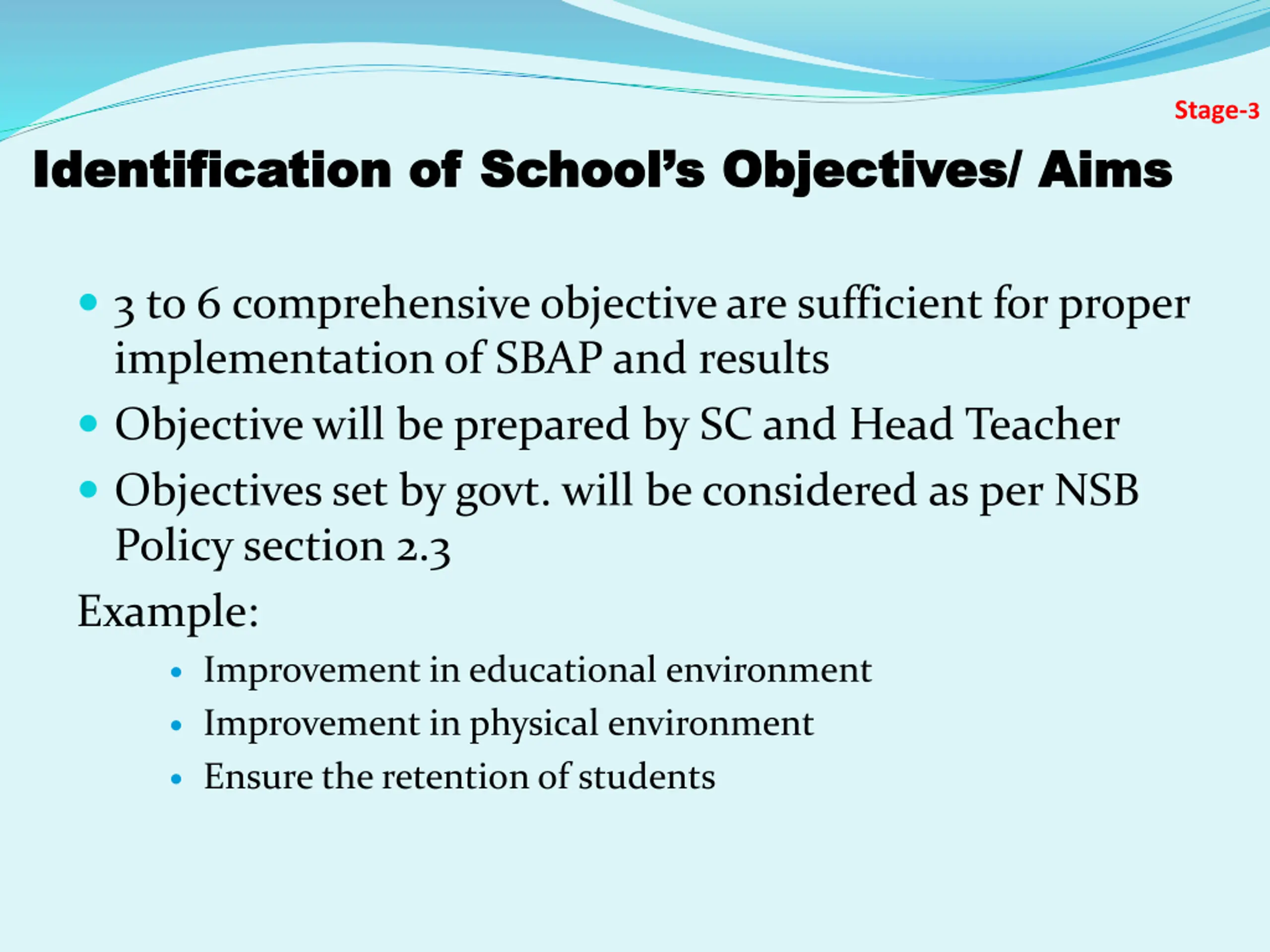 Stage-3 Identification of School s Objectives/ Aims Identification of School s Objectives/ Aims 3 to 6 comprehensive objective are sufficient for proper implementation of SBAP and results Objective will be prepared by SC and Head Teacher Objectives set by govt. will be considered as per NSB Policy section 2.3 Example: Improvement in educational environment Improvement in physical environment Ensure the retention of students