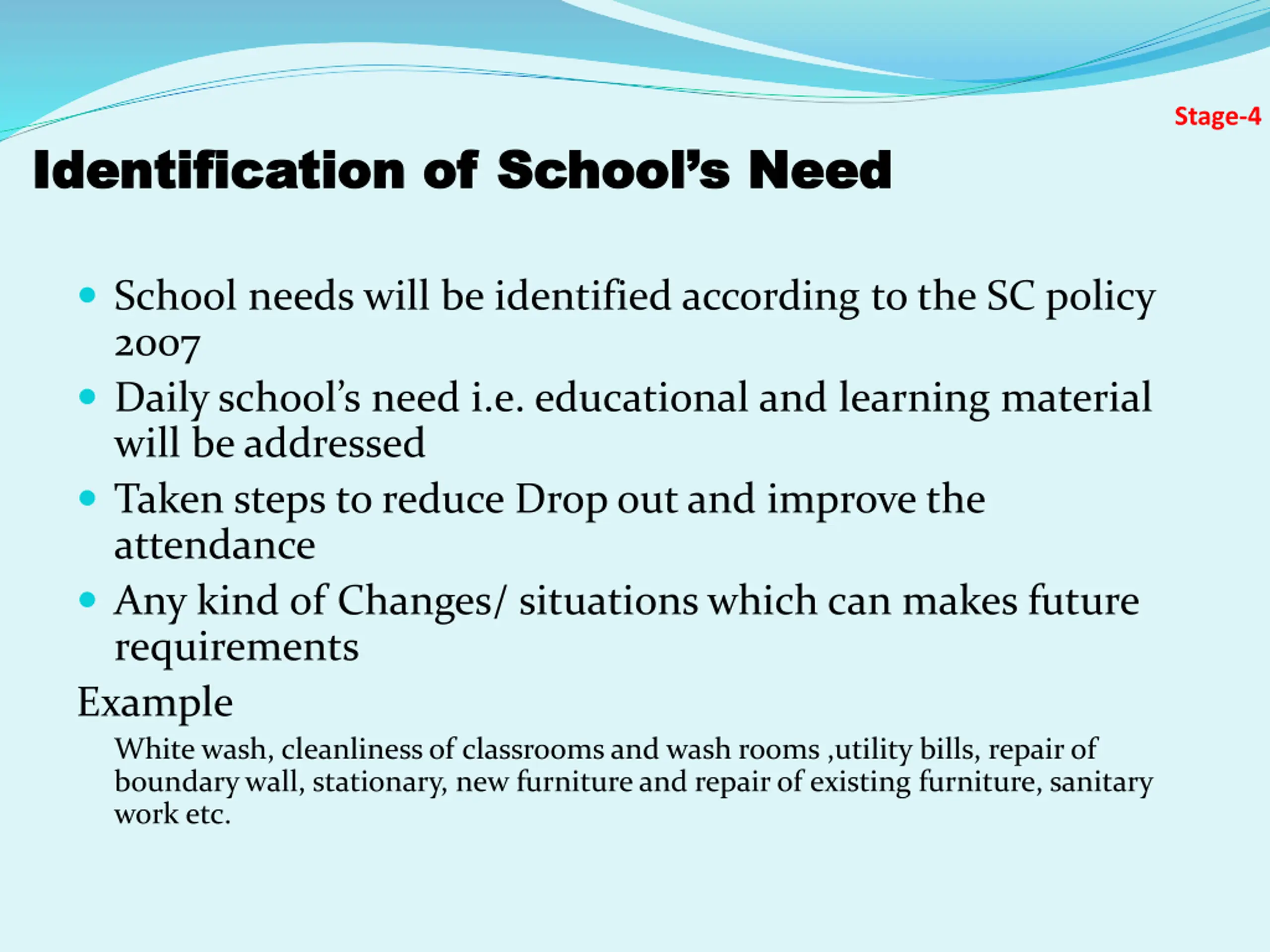 Stage-4 Identification of School s Need Identification of School s Need School needs will be identified according to the SC policy 2007 Daily school s need i.e. educational and learning material will be addressed Taken steps to reduce Drop out and improve the attendance Any kind of Changes/ situations which can makes future requirements Example White wash, cleanliness of classrooms and wash rooms ,utility bills, repair of boundary wall, stationary, new furniture and repair of existing furniture, sanitary work etc.