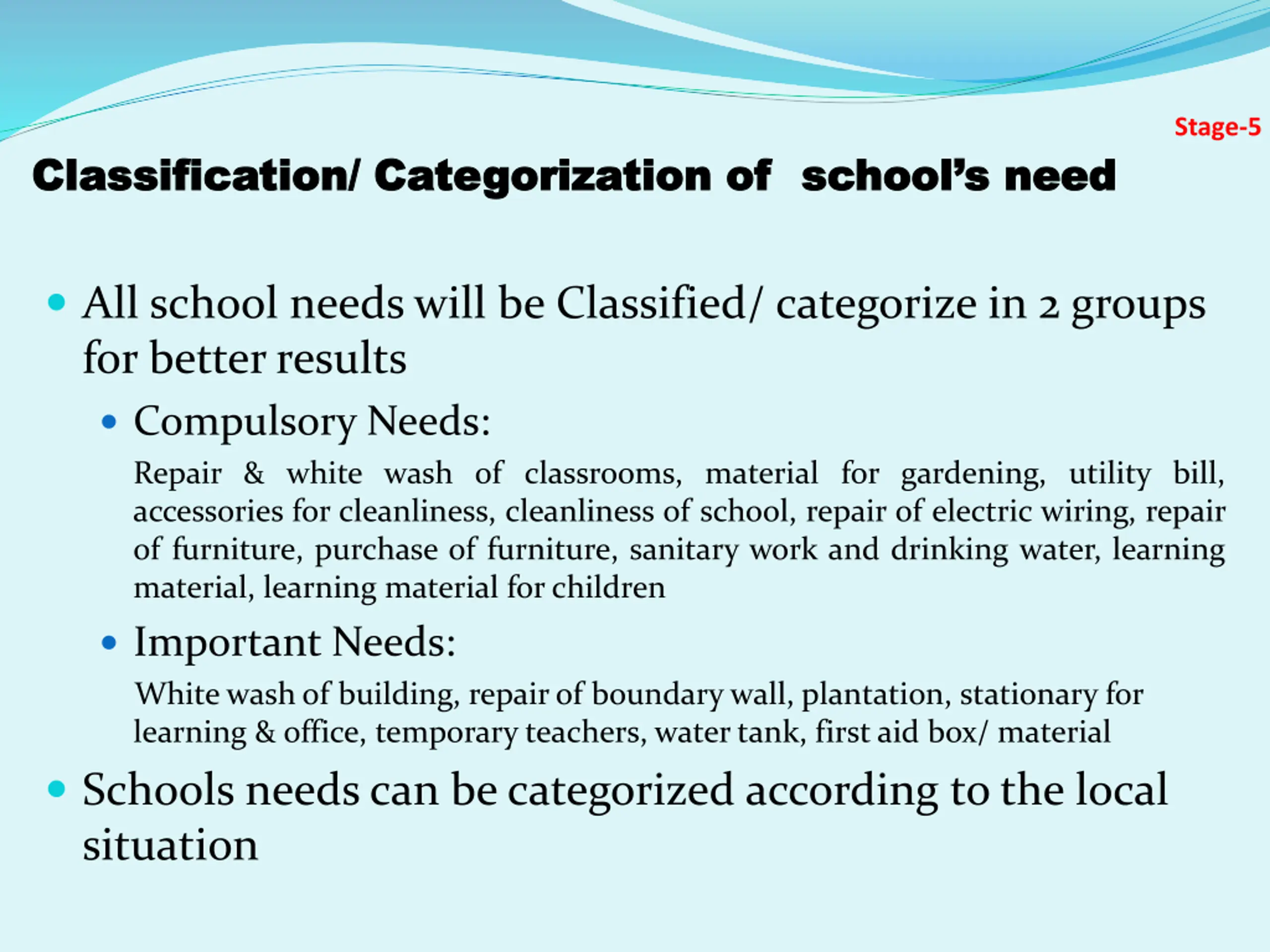 Stage-5 Classification/ Categorization of school s need Classification/ Categorization of school s need All school needs will be Classified/ categorize in 2 groups for better results Compulsory Needs: Repair & white wash of classrooms, material for gardening, utility bill, accessories for cleanliness, cleanliness of school, repair of electric wiring, repair of furniture, purchase of furniture, sanitary work and drinking water, learning material, learning material for children Important Needs: White wash of building, repair of boundary wall, plantation, stationary for learning & office, temporary teachers, water tank, first aid box/ material Schools needs can be categorized according to the local situation