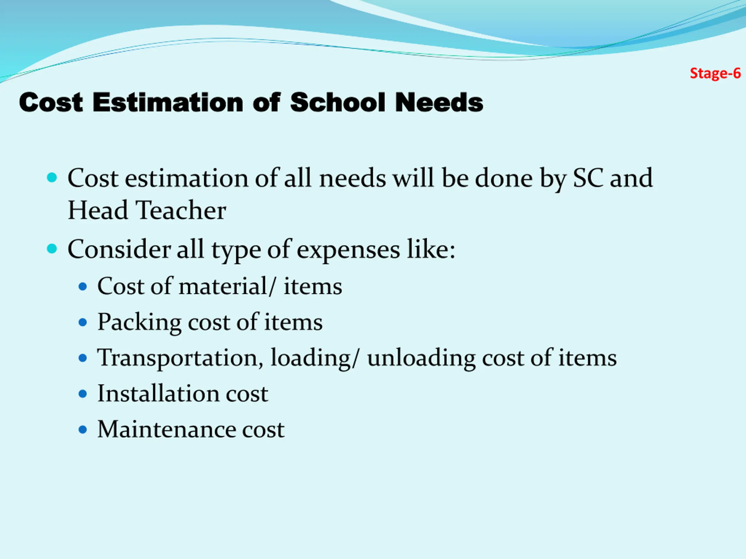 Stage-6 Cost Estimation of School Needs Cost Estimation of School Needs Cost estimation of all needs will be done by SC and Head Teacher Consider all type of expenses like: Cost of material/ items Packing cost of items Transportation, loading/ unloading cost of items Installation cost Maintenance cost