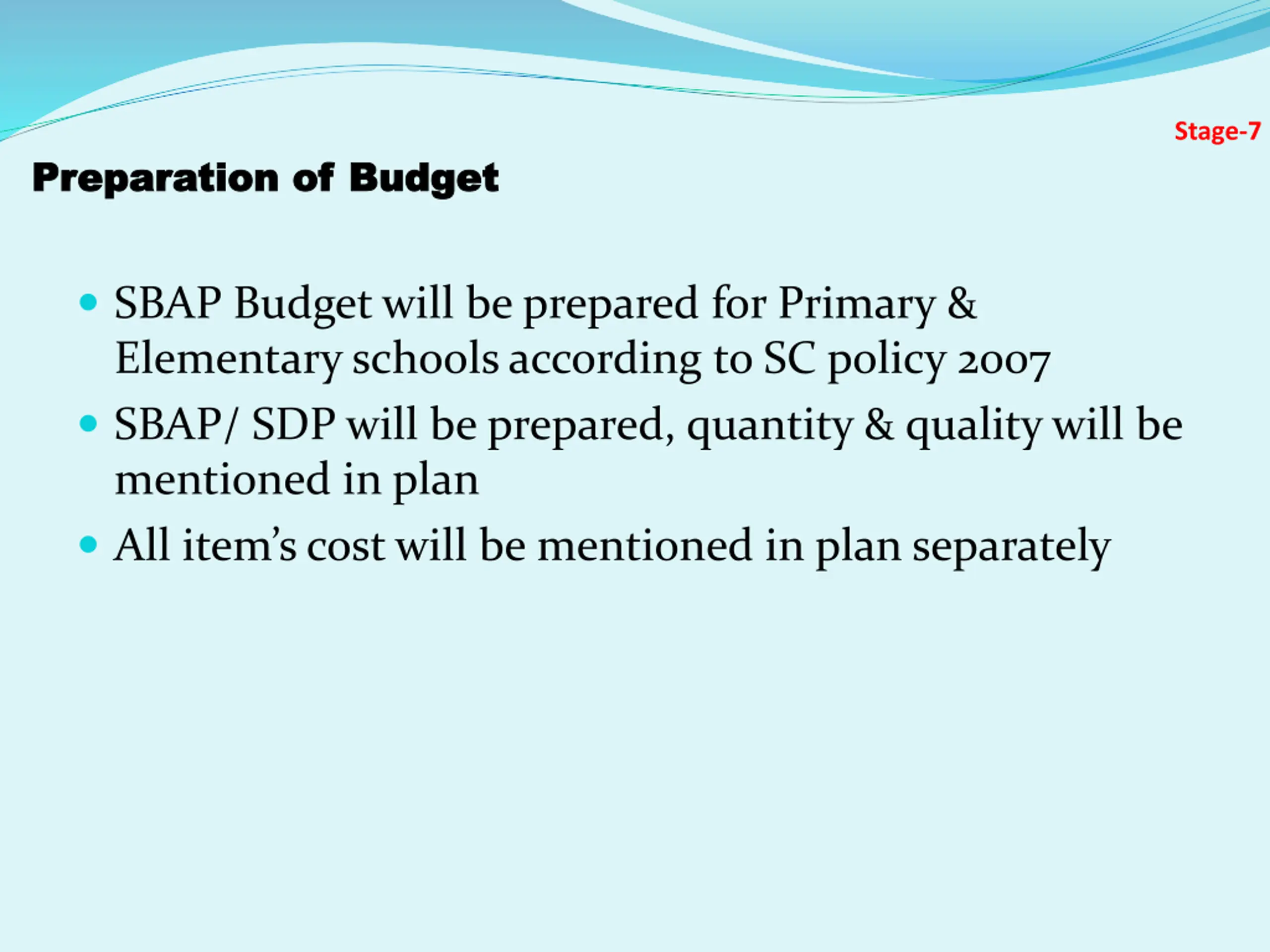 Stage-7 Preparation of Budget Preparation of Budget SBAP Budget will be prepared for Primary & Elementary schools according to SC policy 2007 SBAP/ SDP will be prepared, quantity & quality will be mentioned in plan All item s cost will be mentioned in plan separately