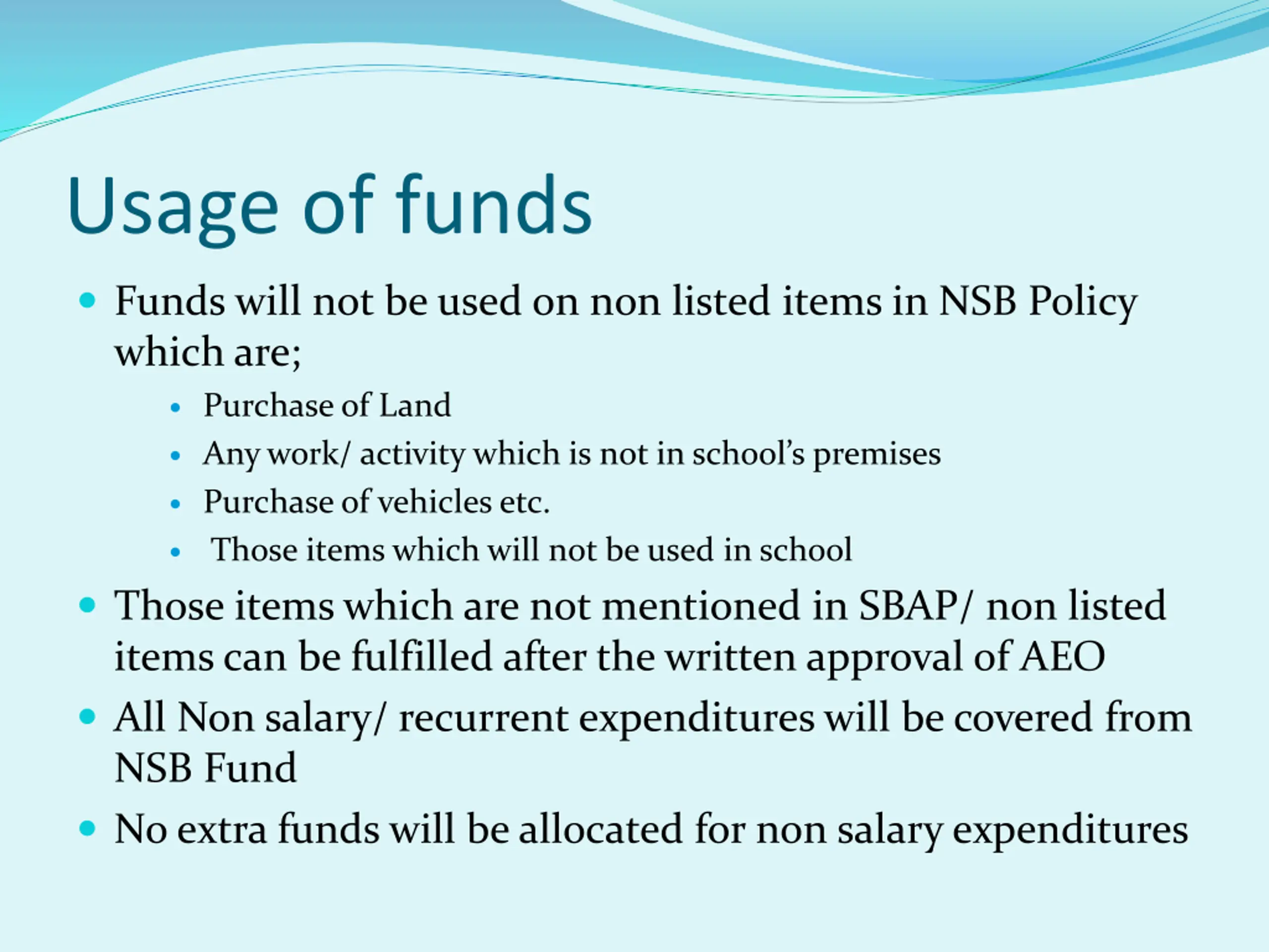 Usage of funds Funds will not be used on non listed items in NSB Policy which are; Purchase of Land Any work/ activity which is not in school s premises Purchase of vehicles etc. Those items which will not be used in school Those items which are not mentioned in SBAP/ non listed items can be fulfilled after the written approval of AEO All Non salary/ recurrent expenditures will be covered from NSB Fund No extra funds will be allocated for non salary expenditures